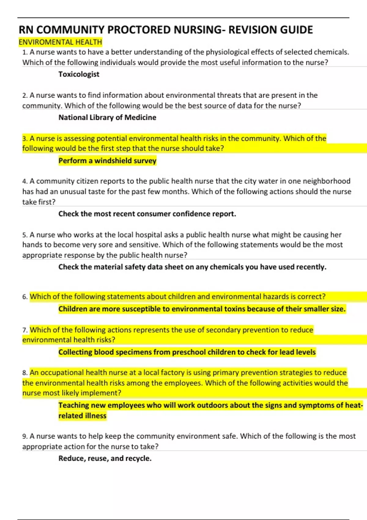 ENVIROMENTAL HEALTH 1. A nurse wants to have a better understanding of the physiological effects of selected chemicals. Which of the following individuals would provide the most useful information to the nurse? Toxicologist 2. A nurse wants to find information about environmental threats that are present in the community. Which of the following would be the best source of data for the nurse? National Library of Medicine 3. A nurse is assessing potential environmental health risks in the community. Which of the following would be the first step that the nurse should take? Perform a windshield survey 4. A community citizen reports to the public health nurse that the city water in one neighborhood has had an unusual taste for the past few months. Which of the following actions should the nurse take first? Check the most recent consumer confidence report. 5. A nurse who works at the local hospital asks a public health nurse what might be causing her hands to become very sore and sensitive. Which of the following statements would be the most appropriate response by the public health nurse? Check the material safety data sheet on any chemicals you have used recently. 6. Which of the following statements about children and environmental hazards is correct? Children are more susceptible to environmental toxins because of their smaller size. 7. Which of the following actions represents the use of secondary prevention to reduce environmental health risks? Collecting blood specimens from preschool children to check for lead levels 8. An occupational health nurse at a local factory is using primary prevention strategies to reduce the environmental health risks among the employees. Which of the following activities would the nurse most likely implement? Teaching new employees who will work outdoors about the signs and symptoms of heat- related illness 9. A nurse wants to help keep the community environment safe. Which of the following is the most appropriate action for the nurse to take? Reduce, reuse, and recycle. 10. Which of the following best describes the purpose of local health departments making unannounced inspections of local restaurants? To ensure compliance 11. A city has announced its plans to build a city dump near a community of poor and predominantly African-American citizens. Which of the following principles would the nurse be using when vocalizing opposition for this plan? Environmental justice 12. A nurse is completing a basic health assessment. Which of the following questions should be asked by an environmentally aware nurse? What jobs have you held longest? 13. A high school student considering a job in the restaurant industry after graduation asks a nurse about workplace safety issues. Which of the following acts would the nurse most likely discuss with the student? d. Occupational Safety and Health Act 14. The nurse is examining blood lead levels in school-age children 1 year after a community-wide education intervention. Which of the following phases of the nursing process is being implemented? d. Evaluation 15. A nurse practitioner has established a mobile clinic to vaccinate noninstitutionalized adults against influenza. Which of the following phases of the nursing process is being implemented? c. Intervention ....................................................................................................CONTINUE