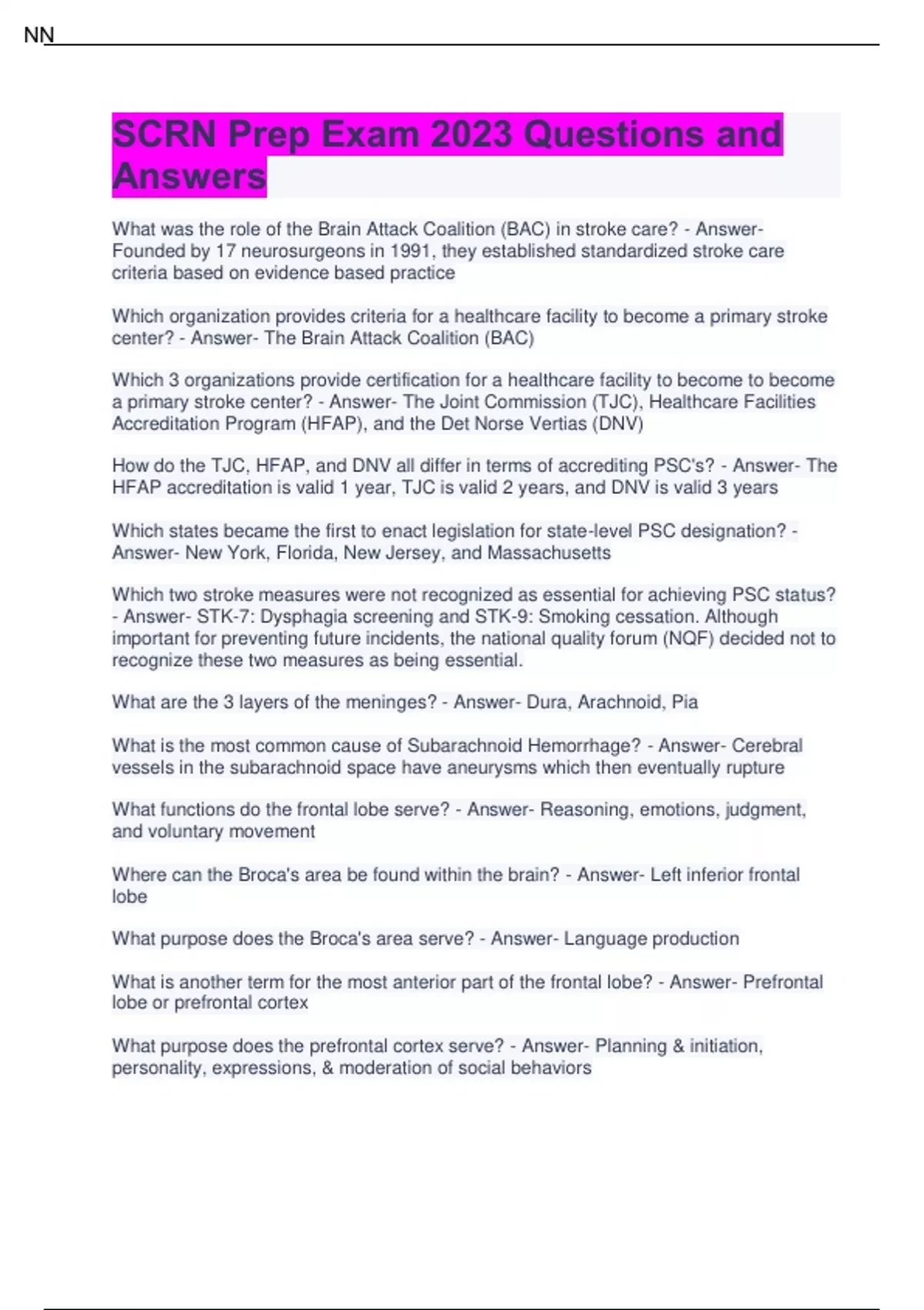 What was the role of the Brain Attack Coalition (BAC) in stroke care? - Answer- Founded by 17 neurosurgeons in 1991, they established standardized stroke care criteria based on evidence based practice Which organization provides criteria for a healthcare facility to become a primary stroke center? - Answer- The Brain Attack Coalition (BAC) Which 3 organizations provide certification for a healthcare facility to become to become a primary stroke center? - Answer- The Joint Commission (TJC), Healthcare Facilities Accreditation Program (HFAP), and the Det Norse Vertias (DNV) How do the TJC, HFAP, and DNV all differ in terms of accrediting PSC's? - Answer- The HFAP accreditation is valid 1 year, TJC is valid 2 years, and DNV is valid 3 years Which states became the first to enact legislation for state-level PSC designation? - Answer- New York, Florida, New Jersey, and Massachusetts Which two stroke measures were not recognized as essential for achieving PSC status? - Answer- STK-7: Dysphagia screening and STK-9: Smoking cessation. Although important for preventing future incidents, the national quality forum (NQF) decided not to recognize these two measures as being essential. What are the 3 layers of the meninges? - Answer- Dura, Arachnoid, Pia What is the most common cause of Subarachnoid Hemorrhage? - Answer- Cerebral vessels in the subarachnoid space have aneurysms which then eventually rupture What functions do the frontal lobe serve? - Answer- Reasoning, emotions, judgment, and voluntary movement Where can the Broca's area be found within the brain? - Answer- Left inferior frontal lobe What purpose does the Broca's area serve? - Answer- Language production What is another term for the most anterior part of the frontal lobe? - Answer- Prefrontal lobe or prefrontal cortex What purpose does the prefrontal cortex serve? - Answer- Planning & initiation, personality, expressions, & moderation of social behaviors