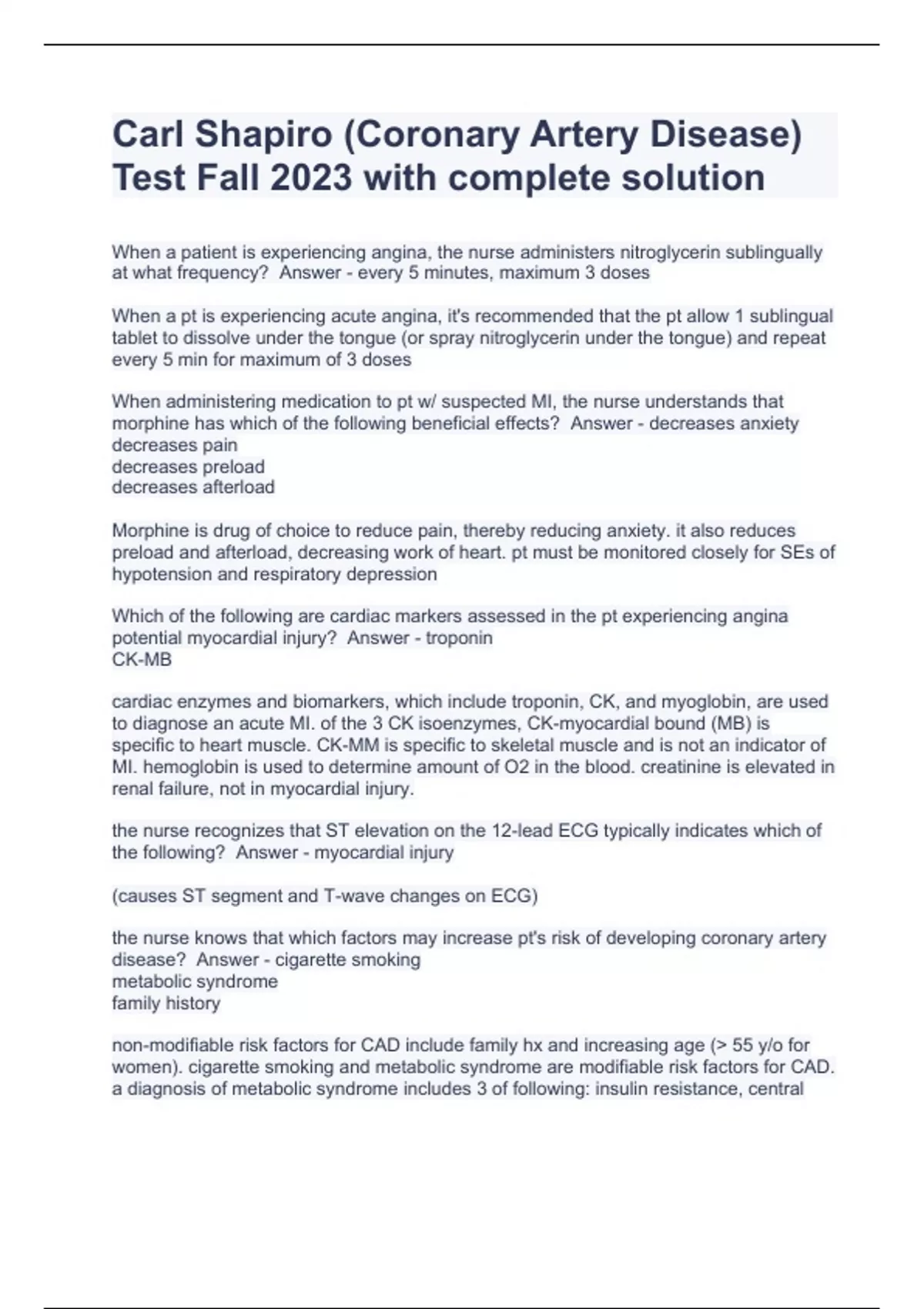 Carl Shapiro (Coronary Artery Disease) Test Fall 2023 with complete solution