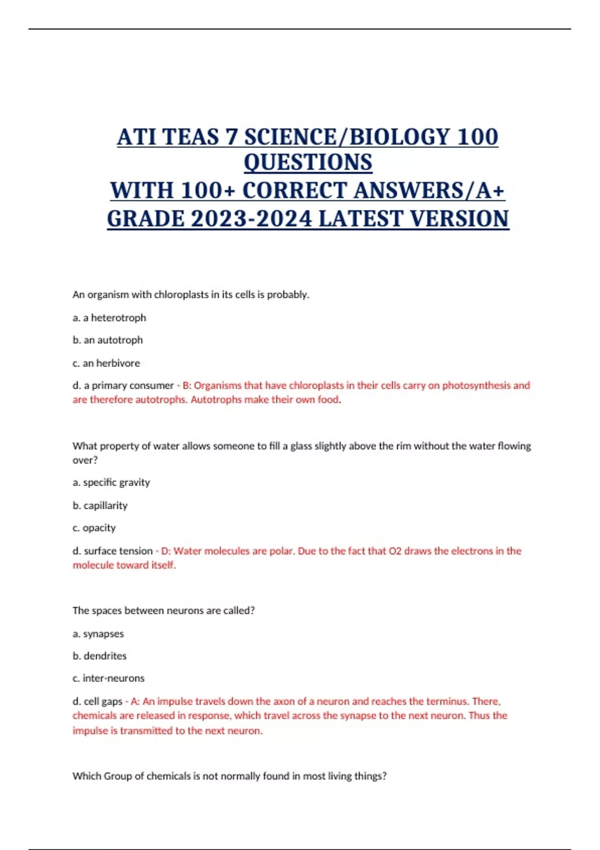 ATI TEAS 7 SCIENCE/BIOLOGY 100 QUESTIONS WITH 100+ CORRECT ANSWERS/A+ GRADE LATEST VERSION