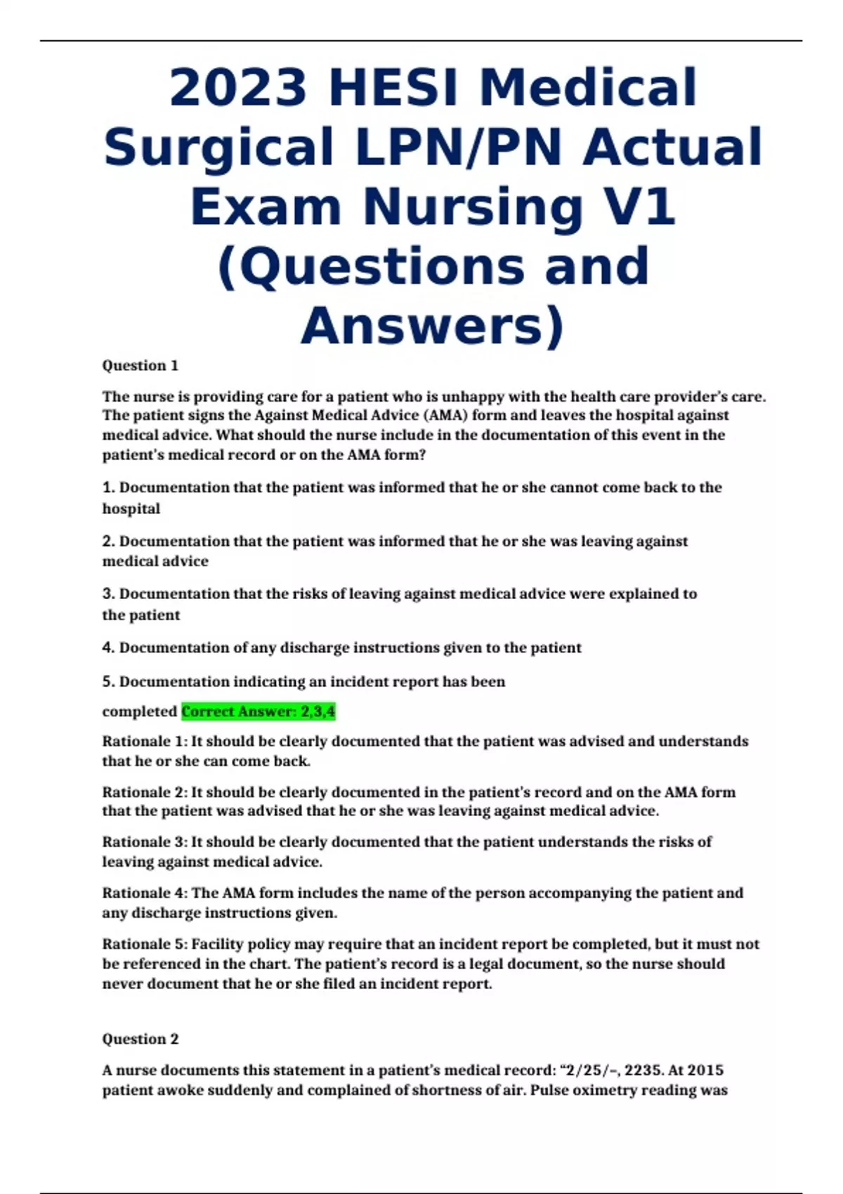 2023 HESI Medical Surgical LPN/PN Actual Exam Nursing V1 (Questions and Answers) The nurse is providing care for a patient who is unhappy with the health care provider’s care. The patient signs the Against Medical Advice (AMA) form and leaves the hospital against medical advice. What should the nurse include in the documentation of this event in the patient’s medical record or on the AMA form? 1. Documentation that the patient was informed that he or she cannot come back to the hospital 2. Documentation that the patient was informed that he or she was leaving against medical advice 3. Documentation that the risks of leaving against medical advice were explained to the patient 4. Documentation of any discharge instructions given to the patient 5. Documentation indicating an incident report has been completed Correct Answer: 2,3,4 Rationale 1: It should be clearly documented that the patient was advised and understands that he or she can come back. Rationale 2: It should be clearly documented in the patient’s record and on the AMA form that the patient was advised that he or she was leaving against medical advice. Rationale 3: It should be clearly documented that the patient understands the risks of leaving against medical advice. Rationale 4: The AMA form includes the name of the person accompanying the patient and any discharge instructions given. Rationale 5: Facility policy may require that an incident report be completed, but it must not be referenced in the chart. The patient’s record is a legal document, so the nurse should never document that he or she filed an incident report.
