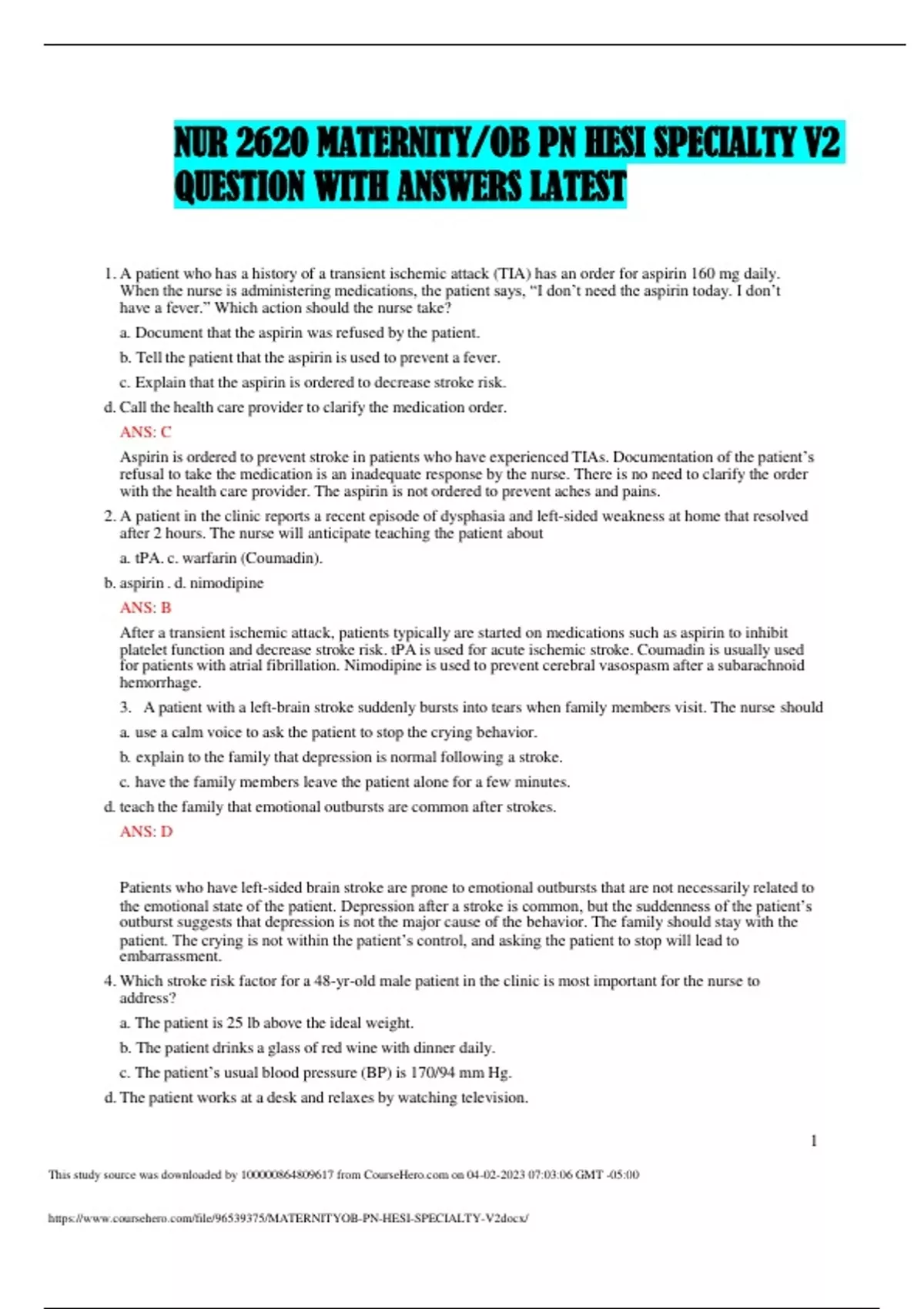 NUR 2620 MATERNITY/OB PN HESI SPECIALTY V2 QUESTION WITH ANSWERS LATEST