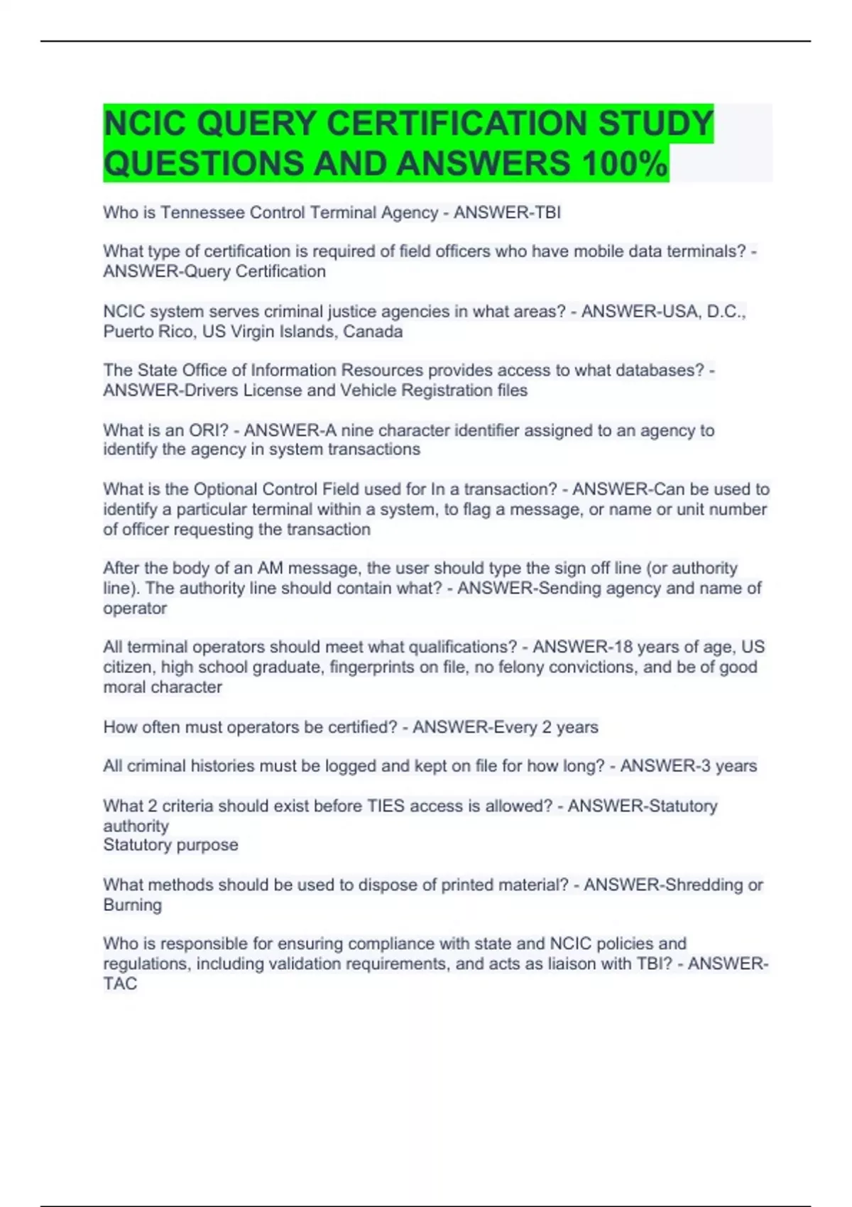 NCIC QUERY CERTIFICATION STUDY QUESTIONS AND ANSWERS 100%