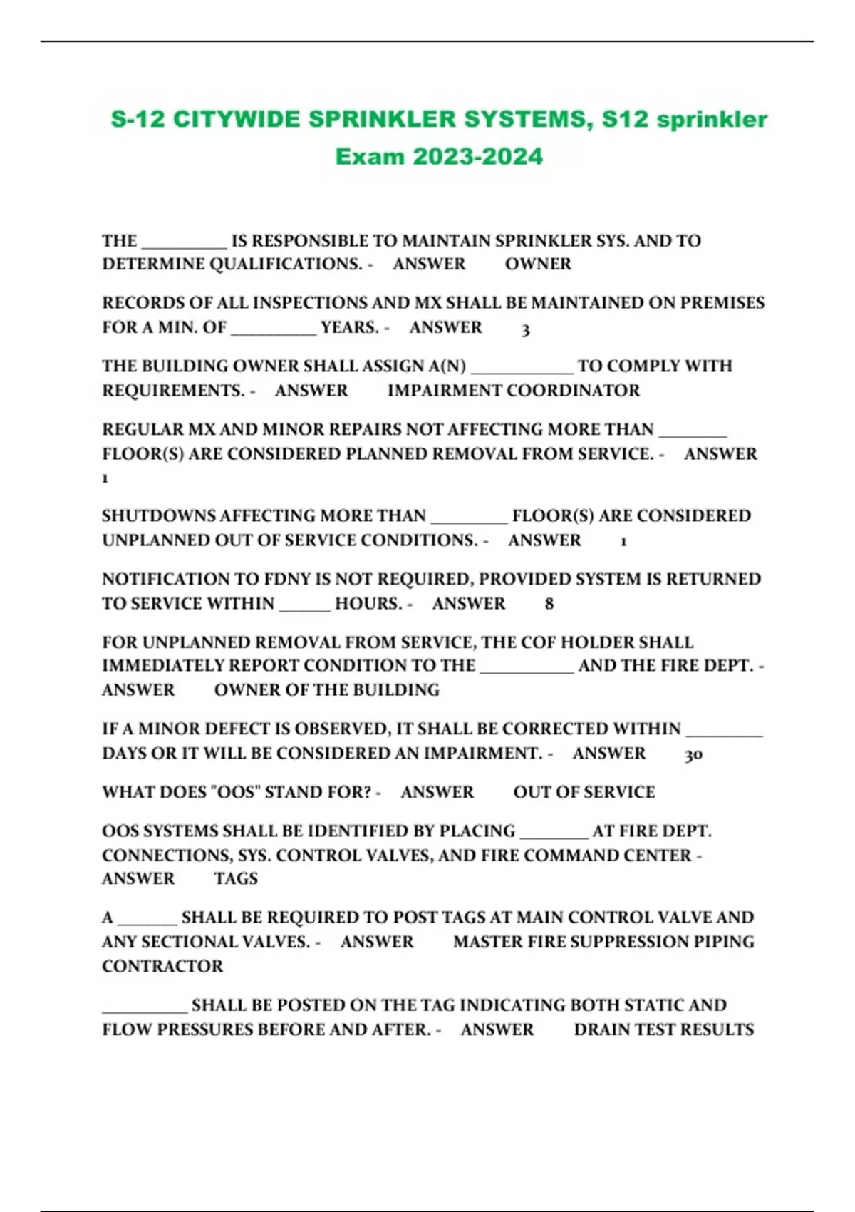 S-12 CITYWIDE SPRINKLER SYSTEMS, S12 sprinkler Exam