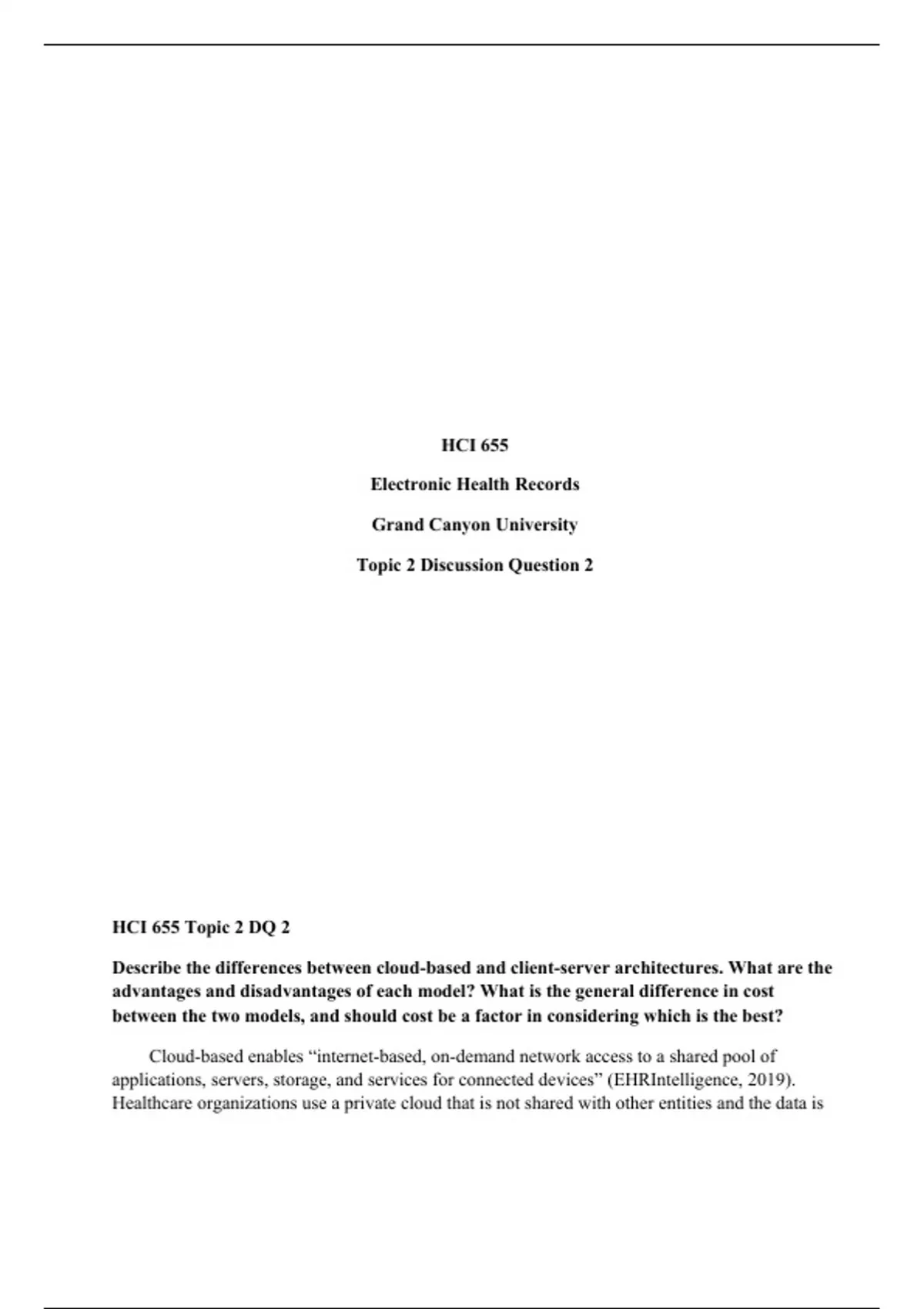 HCI 655 (Electronic Health Records) Topic 2 Discussion Question 2 Description: Describe the differences between cloud-based and client-server architectures. What are the advantages and disadvantages of each model? What is the general difference in cost between the two models, and should cost be a factor in considering which is the best?