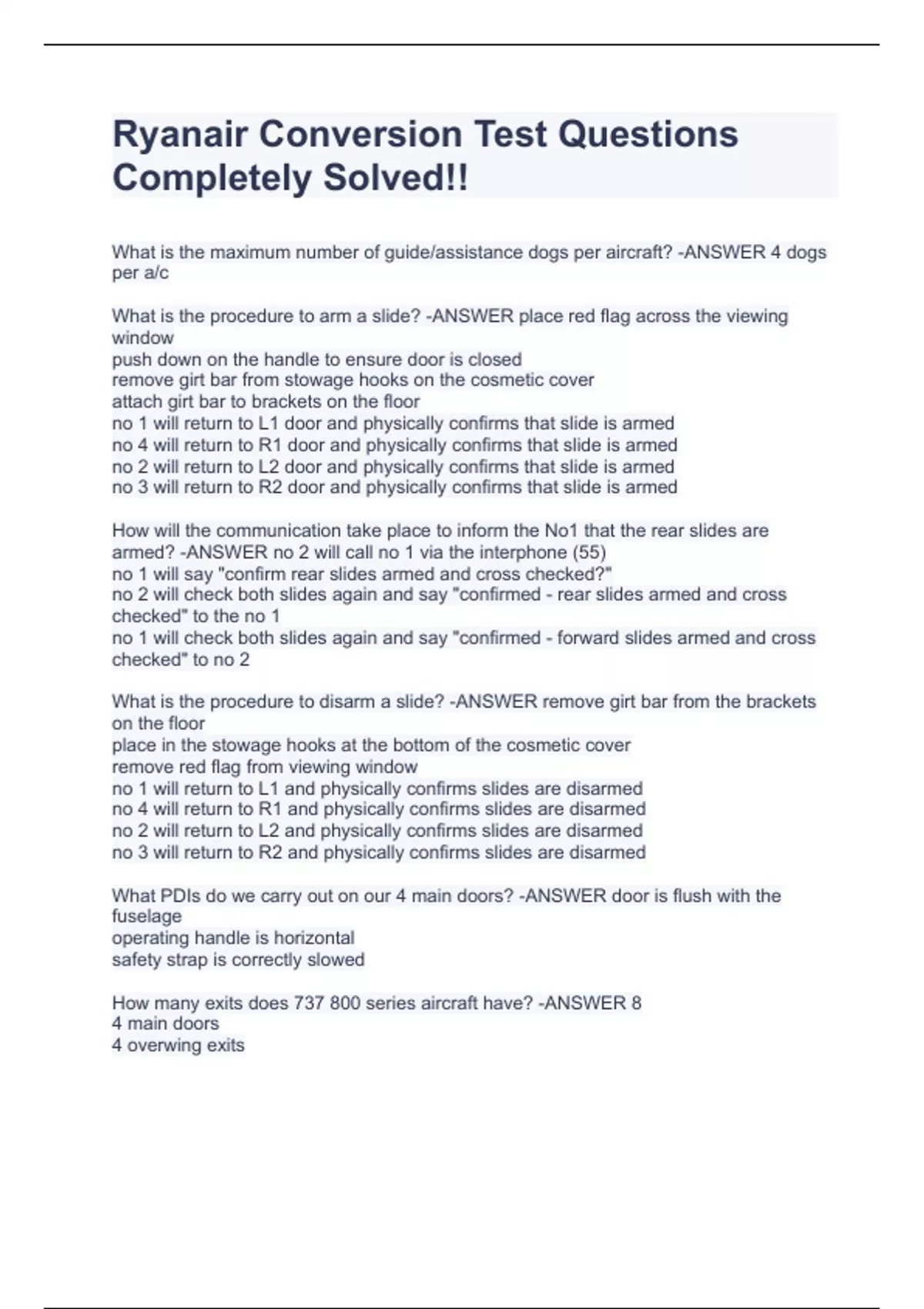 What is the maximum number of guide/assistance dogs per aircraft? -ANSWER 4 dogs per a/c What is the procedure to arm a slide? -ANSWER place red flag across the viewing window push down on the handle to ensure door is closed remove girt bar from stowage hooks on the cosmetic cover attach girt bar to brackets on the floor no 1 will return to L1 door and physically confirms that slide is armed no 4 will return to R1 door and physically confirms that slide is armed no 2 will return to L2 door and physically confirms that slide is armed no 3 will return to R2 door and physically confirms that slide is armed How will the communication take place to inform the No1 that the rear slides are armed? -ANSWER no 2 will call no 1 via the interphone (55) no 1 will say "confirm rear slides armed and cross checked?" no 2 will check both slides again and say "confirmed - rear slides armed and cross checked" to the no 1 no 1 will check both slides again and say "confirmed - forward slides armed and cross checked" to no 2 What is the procedure to disarm a slide? -ANSWER remove girt bar from the brackets on the floor place in the stowage hooks at the bottom of the cosmetic cover remove red flag from viewing window no 1 will return to L1 and physically confirms slides are disarmed no 4 will return to R1 and physically confirms slides are disarmed no 2 will return to L2 and physically confirms slides are disarmed no 3 will return to R2 and physically confirms slides are disarmed What PDIs do we carry out on our 4 main doors? -ANSWER door is flush with the fuselage operating handle is horizontal safety strap is correctly slowed