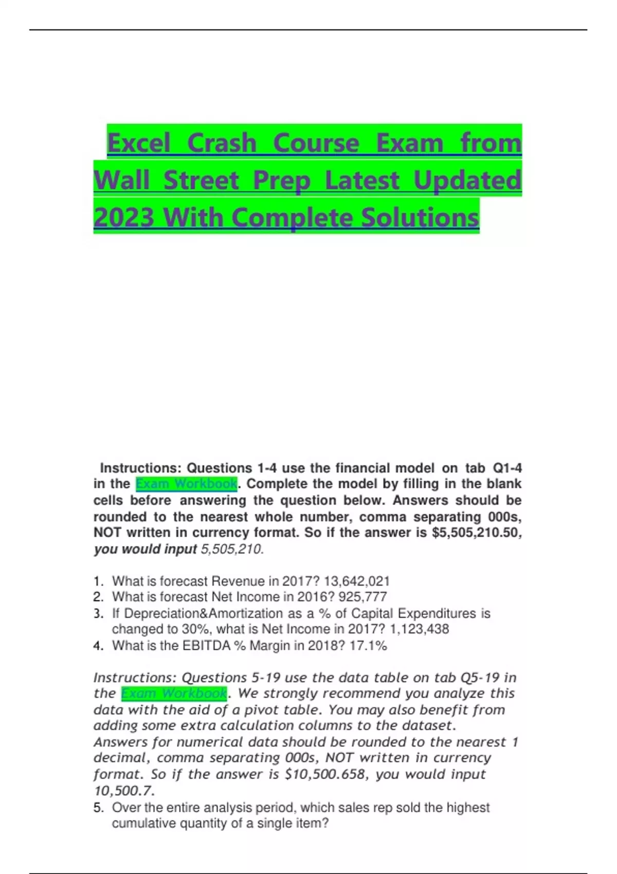 Excel Crash Course Exam from Wall Street Prep Latest Updated 2023 With Complete Solutions Instructions: Questions 1-4 use the financial model on tab Q1-4 in the Exam Workbook. Complete the model by filling in the blank cells before answering the question below. Answers should be rounded to the nearest whole number, comma separating 000s, NOT written in currency format. So if the answer is $5,505,210.50, you would input 5,505,210. 1. What is forecast Revenue in 2017? 13,642,021 2. What is forecast Net Income in 2016? 925,777 3. If Depreciation&Amortization as a % of Capital Expenditures is changed to 30%, what is Net Income in 2017? 1,123,438 4. What is the EBITDA % Margin in 2018? 17.1% Instructions: Questions 5-19 use the data table on tab Q5-19 in the Exam Workbook. We strongly recommend you analyze this data with the aid of a pivot table. You may also benefit from adding some extra calculation columns to the dataset. Answers for numerical data should be rounded to the nearest 1 decimal, comma separating 000s, NOT written in currency format. So if the answer is $10,500.658, you would input 10,500.7. 5. Over the entire analysis period, which sales rep sold the highest cumulative quantity of a single item? Rob Stewart 6. In the last question you determined the sales person who sold the highest cumulative quantity of a single item. What is the item code of that item? 16 7. Over the entire analysis period, what is the highest selling item code by quantity? 16 8. Over the entire analysis period, what is the second highest selling item code by quantity? 39 9. Only considering postal codes 93372, 93403 and 93434, which postal code had the highest total profit during the month of March? 93372 10. In the last question you determined the postal code that had the highest total profit during the month of March. What was the profit? 13691.4 11. During the month of April, which postal code bought the most of item 13 by quantity? 93558 12. In the last question, you determined the postal code that bought the most of item 13 by quantity for the month of April. What was that quantity? 24 13. What is the total of Amy Adam’s sales over the analysis period? 492,153.8