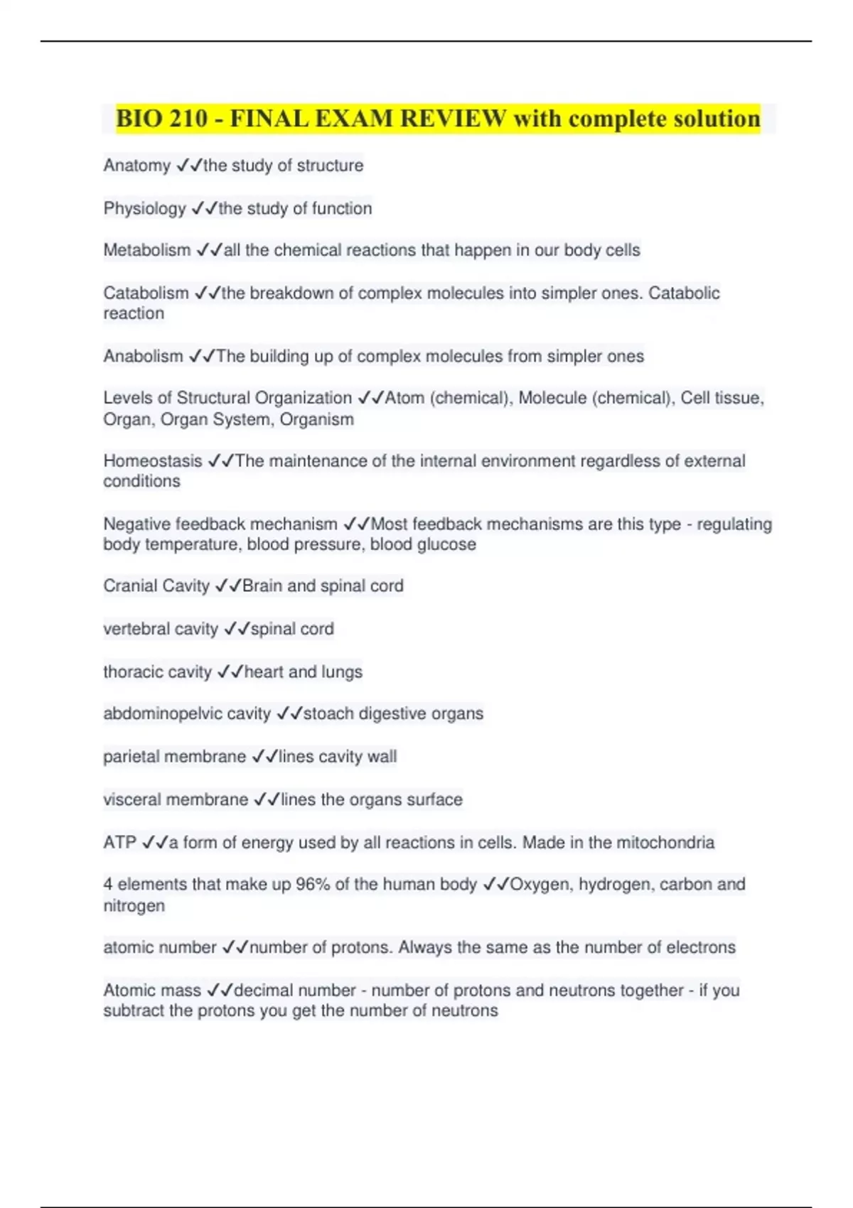 BIO 210 - FINAL EXAM REVIEW with complete solution