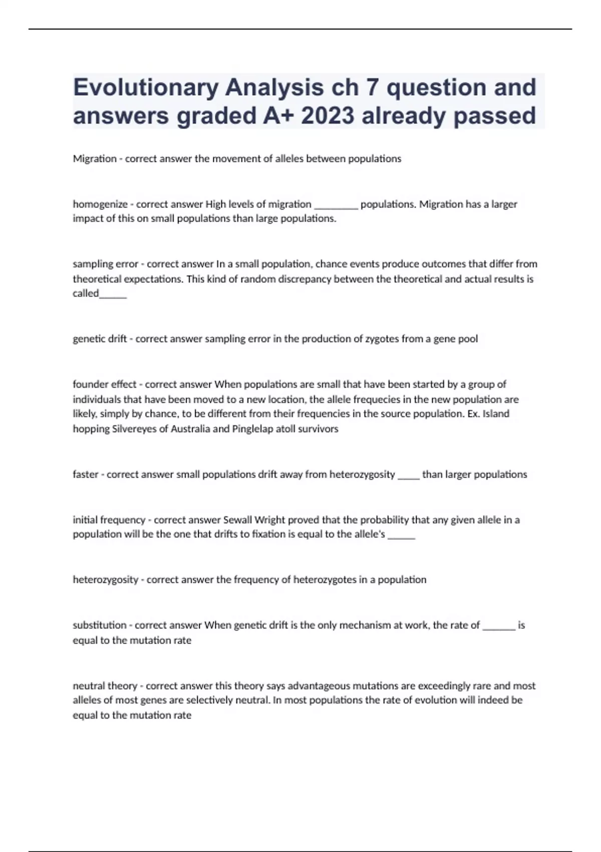 Evolutionary Analysis ch 7 question and answers graded A+ 2023 already passedMigration - correct answer the movement of alleles between populations homogenize - correct answer High levels of migration ________ populations. Migration has a larger impact of this on small populations than large populations. sampling error - correct answer In a small population, chance events produce outcomes that differ from theoretical expectations. This kind of random discrepancy between the theoretical and actual results is called_____ genetic drift - correct answer sampling error in the production of zygotes from a gene pool founder effect - correct answer When populations are small that have been started by a group of individuals that have been moved to a new location, the allele frequecies in the new population are likely, simply by chance, to be different from their frequencies in the source population. Ex. Island hopping Silvereyes of Australia and Pinglelap atoll survivors faster - correct answer small populations drift away from heterozygosity ____ than larger populations initial frequency - correct answer Sewall Wright proved that the probability that any given allele in a population will be the one that drifts to fixation is equal to the allele's _____ heterozygosity - correct answer the frequency of heterozygotes in a population substitution - correct answer When genetic drift is the only mechanism at work, the rate of ______ is equal to the mutation rate neutral theory - correct answer this theory says advantageous mutations are exceedingly rare and most alleles of most genes are selectively neutral. In most populations the rate of evolution will indeed be equal to the mutation rate