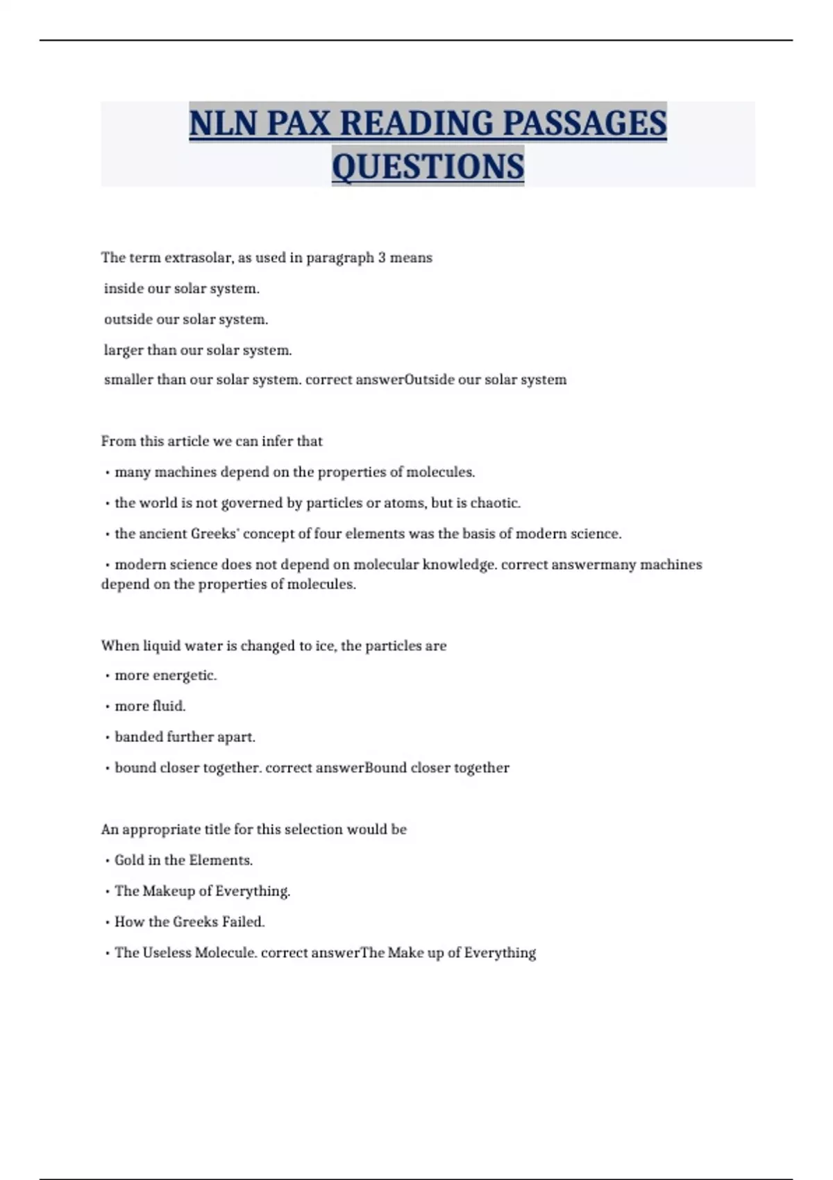 NLN PAX READING PASSAGES QUESTIONS AND ANSWERS.