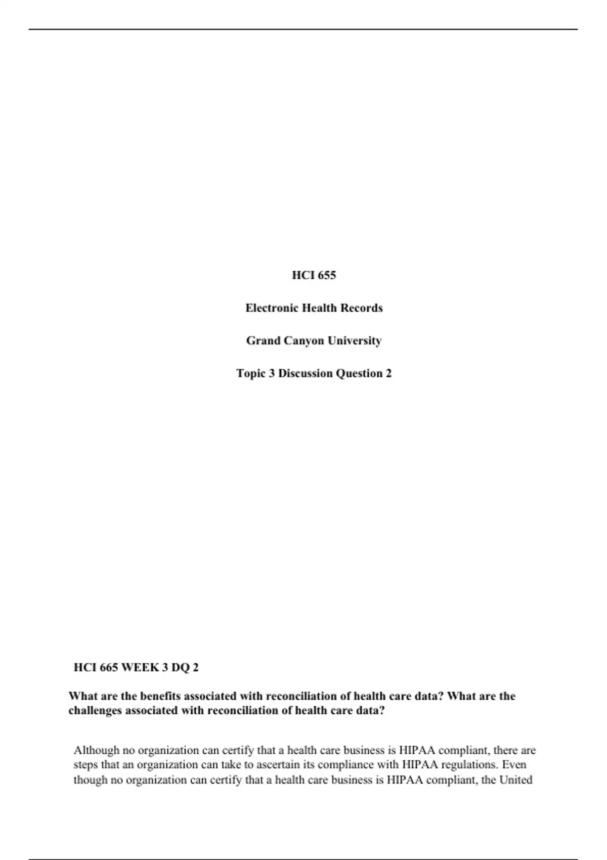 HCI 655 (Electronic Health Records) Topic 3 Discussion Question 2 Description: What are the benefits associated with the reconciliation of healthcare data? What are the challenges associated with the reconciliation of health care data?