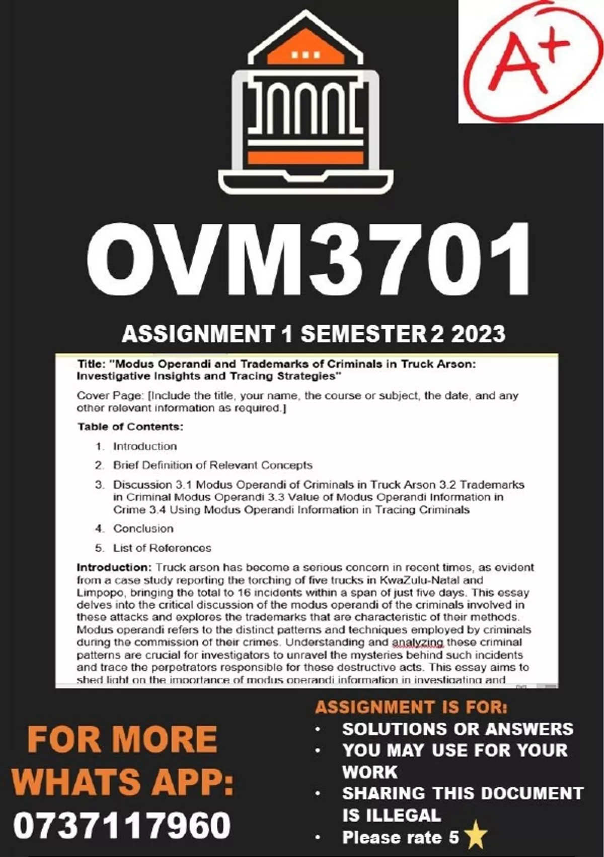 OVM3701 Assignment 1 Semester 2 2023 (ANSWERS) Use the criteria below as guidelines to write your essay: • Formulate the title after reading the below case study (2) • Cover Page (3) • Table of Contents (5) • Write an introduction of one paragraph consisting of five to six sentences (5) • Briefly define the relevant concepts (5) • Discussion (20) • Conclusion (5) • List of references (5) Page 2 of 4 Case study Five trucks were torched in KwaZulu-Natal and Limpopo. This brings to 16 the number of trucks set alight between 7 and 11 July 2023. All the drivers were robbed. The number of trucks that have been destroyed in arson attacks in the past three days has risen to 16 after five more were set alight in KwaZulu-Natal and Limpopo. Eleven were torched over the weekend – six in KwaZulu-Natal on Saturday and five in Mpumalanga on Sunday night. Allegations were that truck drivers were attacked and robbed before two trucks were set alight. It is alleged that the incident took place shortly before 22:00 while the drivers were in a queue on the N2. The men were forced out of the trucks before the trucks were set alight. Police are investigating a case of armed robbery, malicious damage to property and attempted murder. On the same day, three trucks were torched in Limpopo (McCain,2023). Against this background, critically discuss modus operandi of the criminals in the above case study and the trademarks that form part of a criminal’s modus operandi. In your answer, indicate the value of modus operandi information in a particular crime and show how you, as investigator, might use this information to trace the criminal. Total [50] References McMcain, N. 2023. Five more trucks set alight in Limpopo and KZN, raising the truck arson total to 16. [Online] available at: 2023).