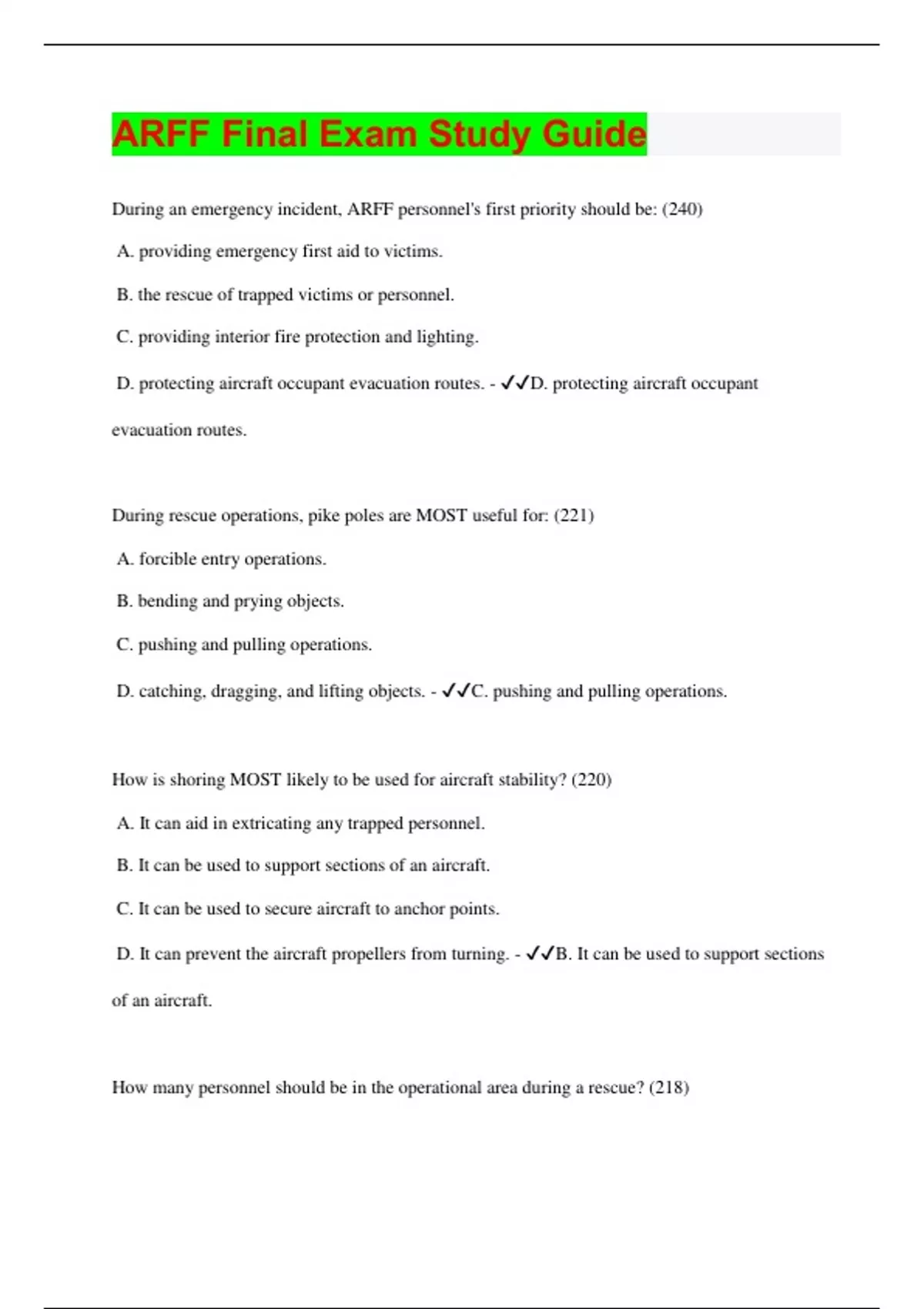 During an emergency incident, ARFF personnel's first priority should be: (240) A. providing emergency first aid to victims. B. the rescue of trapped victims or personnel. C. providing interior fire protection and lighting. D. protecting aircraft occupant evacuation routes. - D. protecting aircraft occupant evacuation routes. During rescue operations, pike poles are MOST useful for: (221) A. forcible entry operations. B. bending and prying objects. C. pushing and pulling operations. D. catching, dragging, and lifting objects. - C. pushing and pulling operations. How is shoring MOST likely to be used for aircraft stability? (220) A. It can aid in extricating any trapped personnel. B. It can be used to support sections of an aircraft. C. It can be used to secure aircraft to anchor points. D. It can prevent the aircraft propellers from turning. - B. It can be used to support sections of an aircraft.