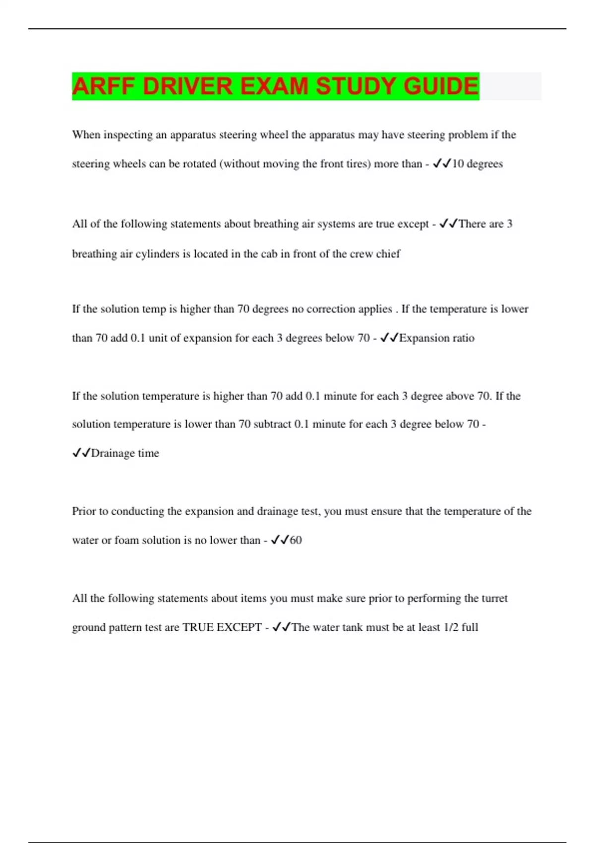 When inspecting an apparatus steering wheel the apparatus may have steering problem if the steering wheels can be rotated (without moving the front tires) more than - 10 degrees All of the following statements about breathing air systems are true except - There are 3 breathing air cylinders is located in the cab in front of the crew chief If the solution temp is higher than 70 degrees no correction applies . If the temperature is lower than 70 add 0.1 unit of expansion for each 3 degrees below 70 - Expansion ratio If the solution temperature is higher than 70 add 0.1 minute for each 3 degree above 70. If the solution temperature is lower than 70 subtract 0.1 minute for each 3 degree below 70 - Drainage time Prior to conducting the expansion and drainage test, you must ensure that the temperature of the water or foam solution is no lower than - 60 All the following statements about items you must make sure prior to performing the turret ground pattern test are TRUE EXCEPT - The water tank must be at least 1/2 full