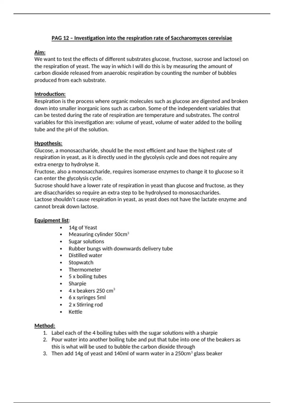 PAG 12 – Investigation into the respiration rate of Saccharomyces cerevisiae