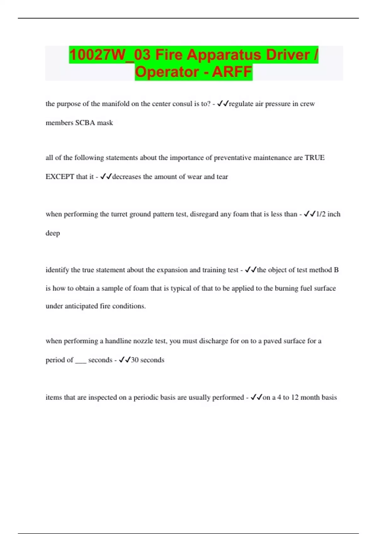 10027W_03 Fire Apparatus Driver / Operator - ARFF | Questions with 100% Correct Answers | Updated & Verified