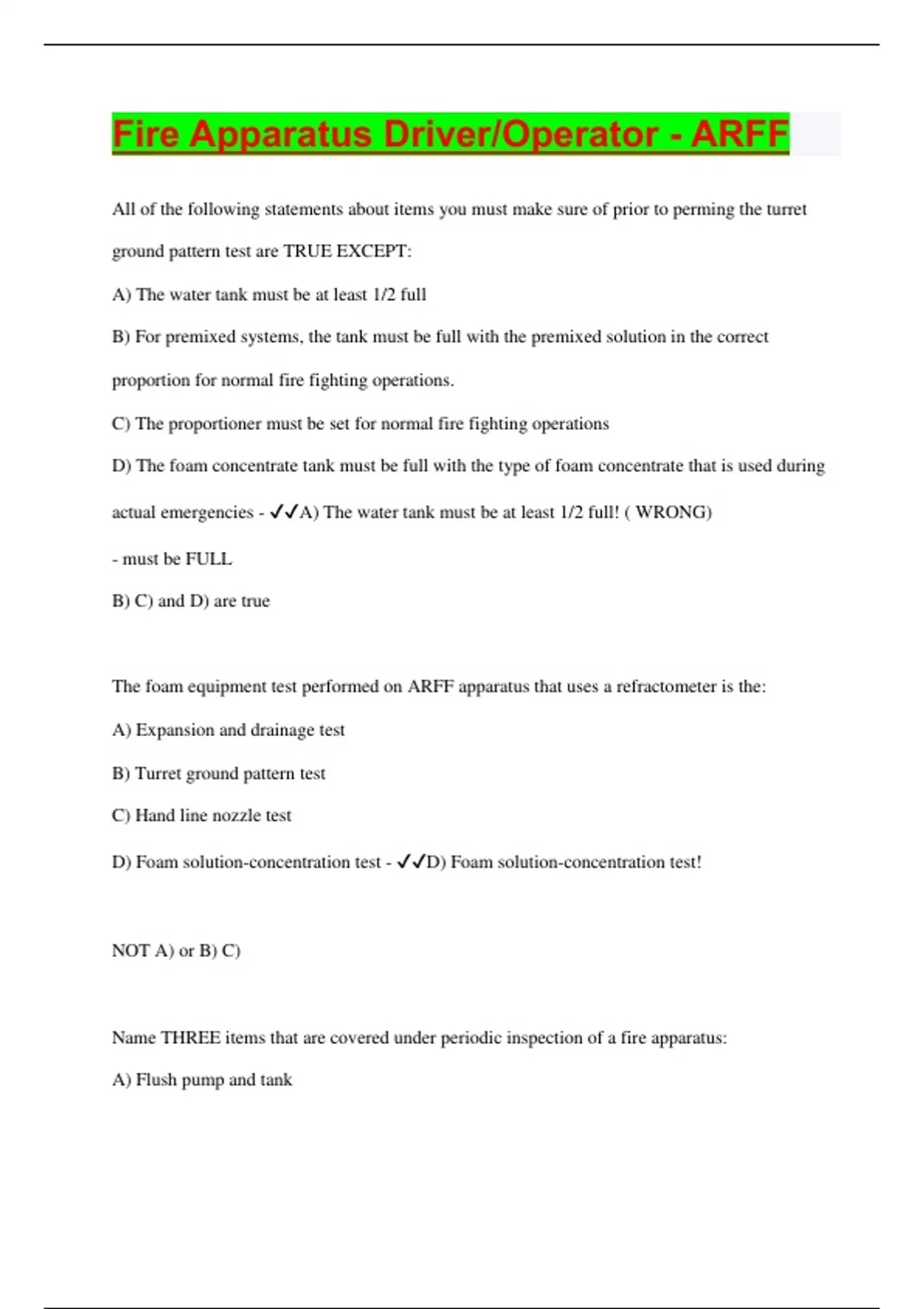 All of the following statements about items you must make sure of prior to perming the turret ground pattern test are TRUE EXCEPT: A) The water tank must be at least 1/2 full B) For premixed systems, the tank must be full with the premixed solution in the correct proportion for normal fire fighting operations. C) The proportioner must be set for normal fire fighting operations D) The foam concentrate tank must be full with the type of foam concentrate that is used during actual emergencies - A) The water tank must be at least 1/2 full! ( WRONG) - must be FULL B) C) and D) are true The foam equipment test performed on ARFF apparatus that uses a refractometer is the: A) Expansion and drainage test B) Turret ground pattern test C) Hand line nozzle test D) Foam solution-concentration test - D) Foam solution-concentration test! NOT A) or B) C) Name THREE items that are covered under periodic inspection of a fire apparatus: A) Flush pump and tank