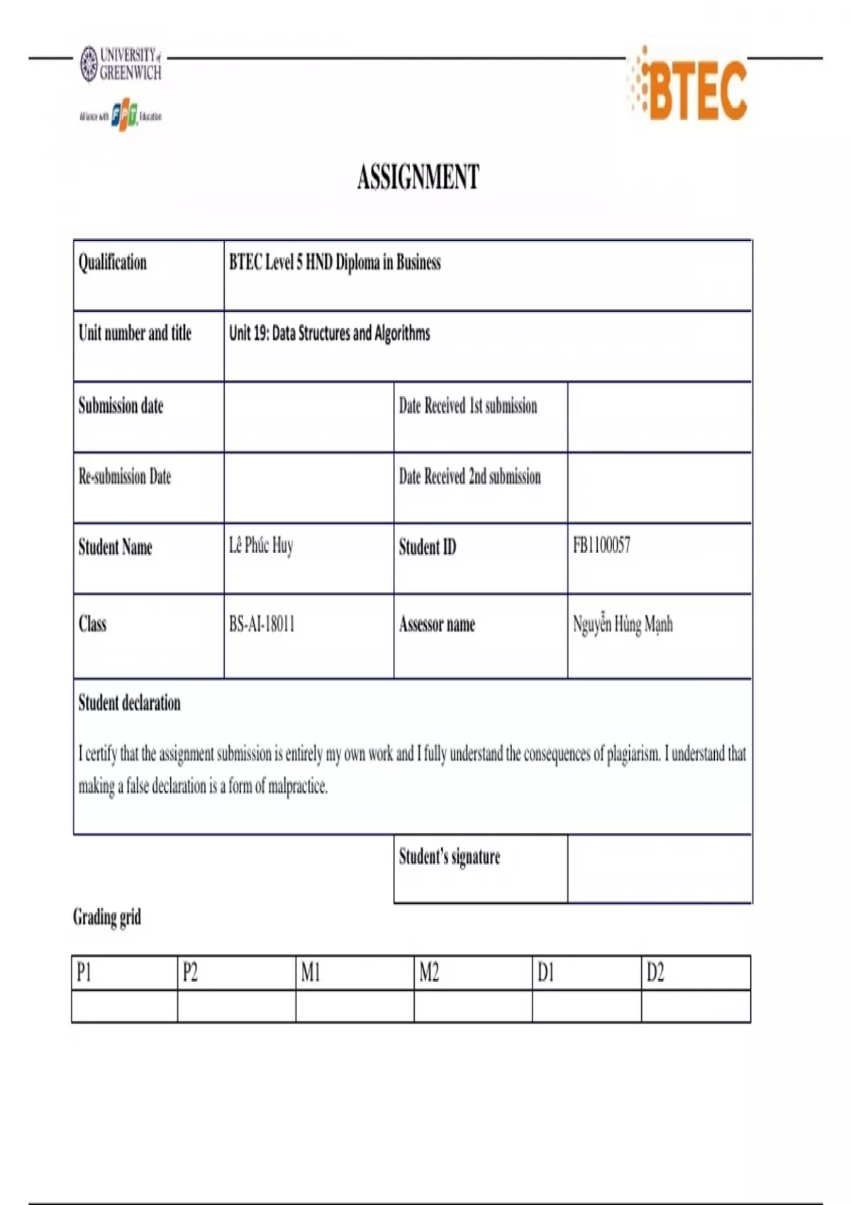 ASSIGNMENT Qualification BTEC Level 5 HND Diploma in Business Unit number and title Unit 19: Data Structures and Algorithms Submission date Date Received 1st submission Re-submission Date Date Received 2nd submission Student Name Lê Phúc Huy Student ID FB Class BS-AI-18011 Assessor name Nguyễn Hùng Mạnh Student declaration I certify that the assignment submission is entirely my own work and I fully understand the consequences of plagiarism. I understand that making a false declaration is a form of malpractice. Student’s signature Grading grid P1 P2 M1 M2 D1 D2 Submission Format: Format: The submission is in the form of an individual written report and a presentation. This should be written in a concise, formal business style using single spacing and font size 12. You are required to make use of headings, paragraphs and subsections as appropriate, and all work must be supported with research and referenced using the Harvard referencing system. Please also provide a bibliography using the Harvard referencing system. Submission Students are compulsory to submit the assignment in due date and in a way requested by the Tutors. The form of submission will be a soft copy in PDF posted on corresponding course of Note: The Assignment must be your own work, and not copied by or from another student or from books etc. If you use ideas, quotes or data (such as diagrams) from books, journals or other sources, you must reference your sources, using the Harvard style. Make sure that you know how to reference properly, and that understand the guidelines on plagiarism. If you do not, you definitely get fail Assignment Brief and Guidance: Scenario: You work as in-house software developer for Soften Development Ltd, a software body-shop providing network provisioning solutions. Your company is part of a collaborative service provisioning development project and your company has won the contract to design and develop a middleware solution that will interface at the front-end to multiple computer provisioning interfaces including SOAP, HTTP, JML and CLI, and the back-end telecom provisioning network via CLI. Your account manager has assigned you a special role that is to inform your team about designing and implementing abstract data types. You have been asked to create a presentation for all collaborating partners on how ADTs can be utilised to improve software design, development and testing. Further, you have been asked to write an introductory report for distribution to all partners on how to specify abstract data types and algorithms in a formal notation. Tasks Part 1 You will need to prepare a presentation on how t