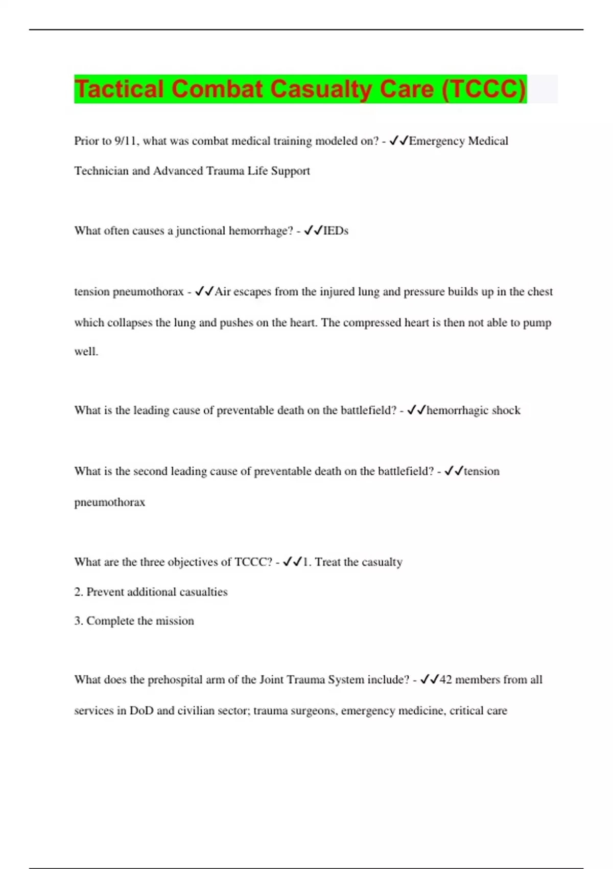 Tactical Combat Casualty Care (TCCC) | 264 Questions with 100% Correct Answers | Updated & Verified | 41 Pages