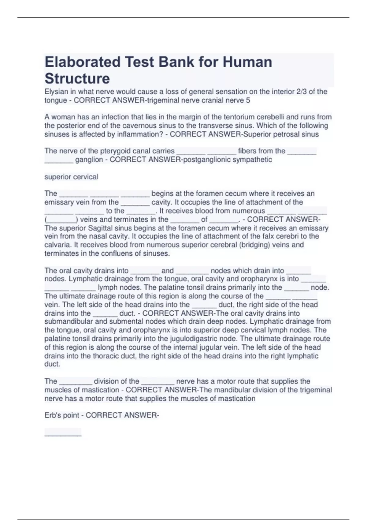 Elaborated Test Bank for Human Structure Elysian in what nerve would cause a loss of general sensation on the interior 2/3 of the tongue - CORRECT ANSWER-trigeminal nerve cranial nerve 5 A woman has an infection that lies in the margin of the tentorium cerebelli and runs from the posterior end of the cavernous sinus to the transverse sinus. Which of the following sinuses is affected by inflammation? - CORRECT ANSWER-Superior petrosal sinus The nerve of the pterygoid canal carries _______ _______ fibers from the _______ _______ ganglion - CORRECT ANSWER-postganglionic sympathetic superior cervical The _______ _______ _______ begins at the foramen cecum where it receives an emissary vein from the _______ cavity. It occupies the line of attachment of the _______ _______ to the _______. It receives blood from numerous _______ _______ (_______) veins and terminates in the _______ of _______. - CORRECT ANSWERThe superior Sagittal sinus begins at the foramen cecum where it receives an emissary vein from the nasal cavity. It occupies the line of attachment of the falx cerebri to the calvaria. It receives blood from numerous superior cerebral (bridging) veins and terminates in the confluens of sinuses. The oral cavity drains into _______ and ________ nodes which drain into ______ nodes. Lymphatic drainage from the tongue, oral cavity and oropharynx is into ______ ______ ______ lymph nodes. The palatine tonsil drains primarily into the ______ node. The ultimate drainage route of this region is along the course of the ______ ______ vein. The left side of the head drains into the ______ duct, the right side of the head drains into the ______ duct. - CORRECT ANSWER-The oral cavity drains into submandibular and submental nodes which drain deep nodes. Lymphatic drainage from the tongue, oral cavity and oropharynx is into superior deep cervical lymph nodes. The palatine tonsil drains primarily into the jugulodigastric node. The ultimate drainage route of this region is along the course of the internal jugular vein. The left side of the head drains into the thoracic duct, the right side of the head drains into the right lymphatic duct. The ________ division of the ________ nerve has a motor route that supplies the muscles of mastication - CORRECT ANSWER-The mandibular division of the trigeminal nerve has a motor route that supplies the muscles of mastication Erb's point - CORRECT ANSWER- _________