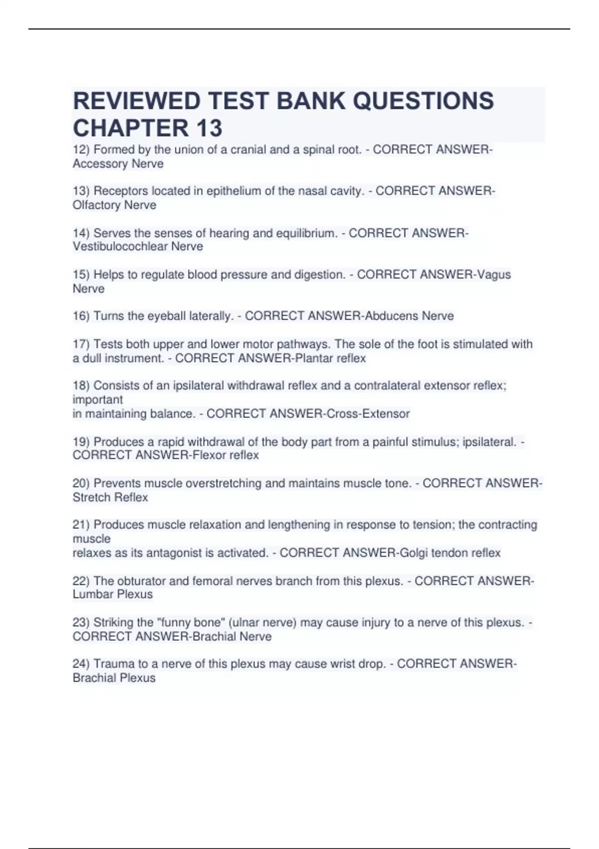 REVIEWED TEST BANK QUESTIONS CHAPTER 13 12) Formed by the union of a cranial and a spinal root. - CORRECT ANSWERAccessory Nerve 13) Receptors located in epithelium of the nasal cavity. - CORRECT ANSWEROlfactory Nerve 14) Serves the senses of hearing and equilibrium. - CORRECT ANSWERVestibulocochlear Nerve 15) Helps to regulate blood pressure and digestion. - CORRECT ANSWER-Vagus Nerve 16) Turns the eyeball laterally. - CORRECT ANSWER-Abducens Nerve 17) Tests both upper and lower motor pathways. The sole of the foot is stimulated with a dull instrument. - CORRECT ANSWER-Plantar reflex 18) Consists of an ipsilateral withdrawal reflex and a contralateral extensor reflex; important in maintaining balance. - CORRECT ANSWER-Cross-Extensor 19) Produces a rapid withdrawal of the body part from a painful stimulus; ipsilateral. - CORRECT ANSWER-Flexor reflex 20) Prevents muscle overstretching and maintains muscle tone. - CORRECT ANSWERStretch Reflex 21) Produces muscle relaxation and lengthening in response to tension; the contracting muscle relaxes as its antagonist is activated. - CORRECT ANSWER-Golgi tendon reflex 22) The obturator and femoral nerves branch from this plexus. - CORRECT ANSWERLumbar Plexus 23) Striking the "funny bone" (ulnar nerve) may cause injury to a nerve of this plexus. - CORRECT ANSWER-Brachial Nerve 24) Trauma to a nerve of this plexus may cause wrist drop. - CORRECT ANSWERBrachial Plexus