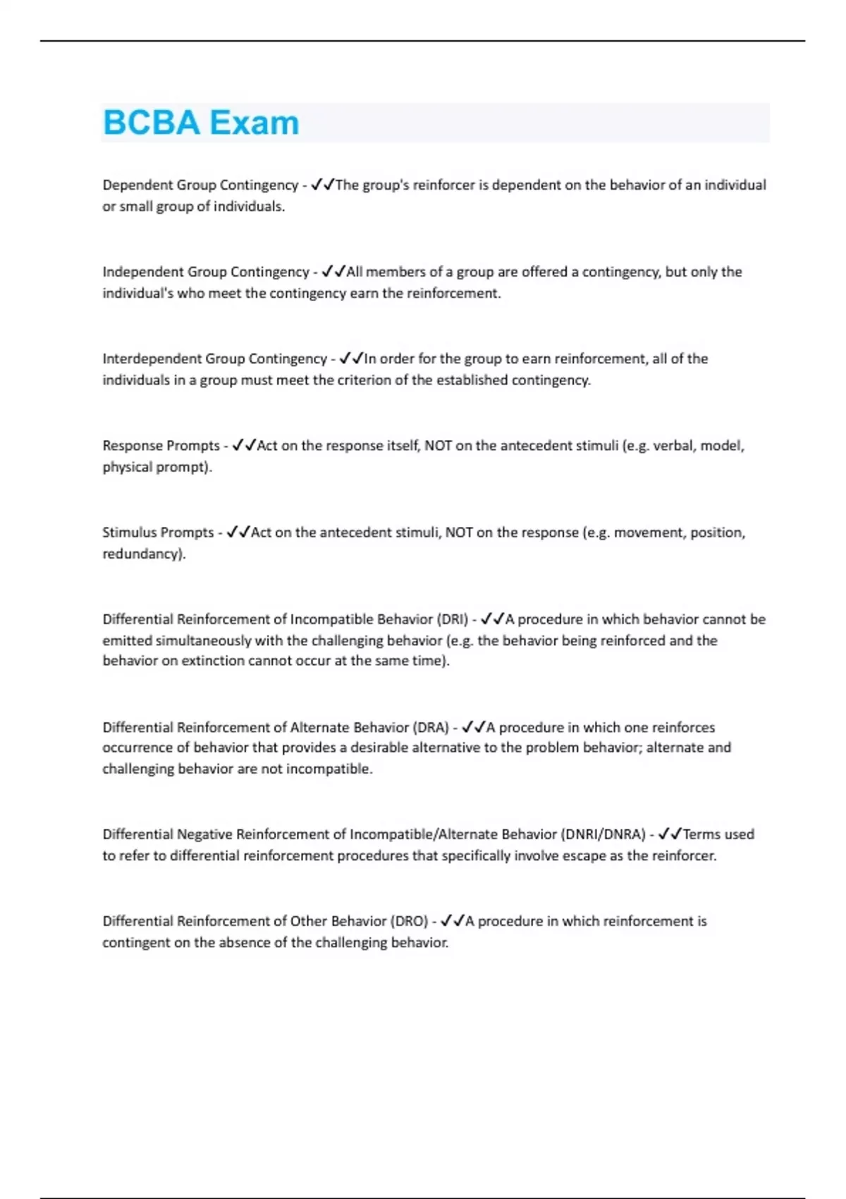 Dependent Group Contingency - The group's reinforcer is dependent on the behavior of an individual or small group of individuals. Independent Group Contingency - All members of a group are offered a contingency, but only the individual's who meet the contingency earn the reinforcement. Interdependent Group Contingency - In order for the group to earn reinforcement, all of the individuals in a group must meet the criterion of the established contingency. Response Prompts - Act on the response itself, NOT on the antecedent stimuli (e.g. verbal, model, physical prompt). Stimulus Prompts - Act on the antecedent stimuli, NOT on the response (e.g. movement, position, redundancy). Differential Reinforcement of Incompatible Behavior (DRI) - A procedure in which behavior cannot be emitted simultaneously with the challenging behavior (e.g. the behavior being reinforced and the behavior on extinction cannot occur at the same time). Differential Reinforcement of Alternate Behavior (DRA) - A procedure in which one reinforces occurrence of behavior that provides a desirable alternative to the problem behavior; alternate and challenging behavior are not incompatible. Differential Negative Reinforcement of Incompatible/Alternate Behavior (DNRI/DNRA) - Terms used to refer to differential reinforcement procedures that specifically involve escape as the reinforcer. Differential Reinforcement of Other Behavior (DRO) - A procedure in which reinforcement is contingent on the absence of the challenging behavior.