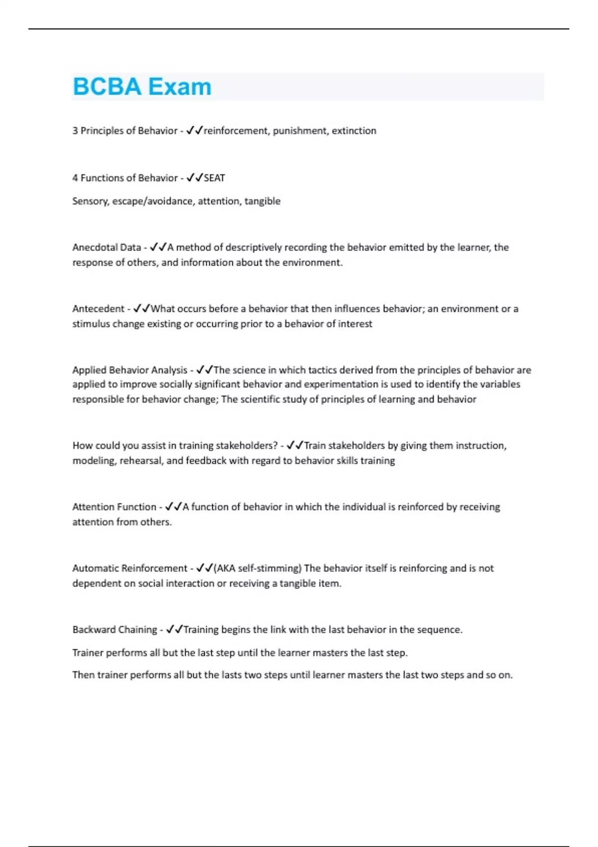 3 Principles of Behavior - reinforcement, punishment, extinction 4 Functions of Behavior - SEAT Sensory, escape/avoidance, attention, tangible Anecdotal Data - A method of descriptively recording the behavior emitted by the learner, the response of others, and information about the environment. Antecedent - What occurs before a behavior that then influences behavior; an environment or a stimulus change existing or occurring prior to a behavior of interest Applied Behavior Analysis - The science in which tactics derived from the principles of behavior are applied to improve socially significant behavior and experimentation is used to identify the variables responsible for behavior change; The scientific study of principles of learning and behavior How could you assist in training stakeholders? - Train stakeholders by giving them instruction, modeling, rehearsal, and feedback with regard to behavior skills training Attention Function - A function of behavior in which the individual is reinforced by receiving attention from others. Automatic Reinforcement - (AKA self-stimming) The behavior itself is reinforcing and is not dependent on social interaction or receiving a tangible item. Backward Chaining - Training begins the link with the last behavior in the sequence. Trainer performs all but the last step until the learner masters the last step. Then trainer performs all but the lasts two steps until learner masters the last two steps and so on.Baseline Data - Data taken before an intervention takes place. Describes the existing level of performance.
