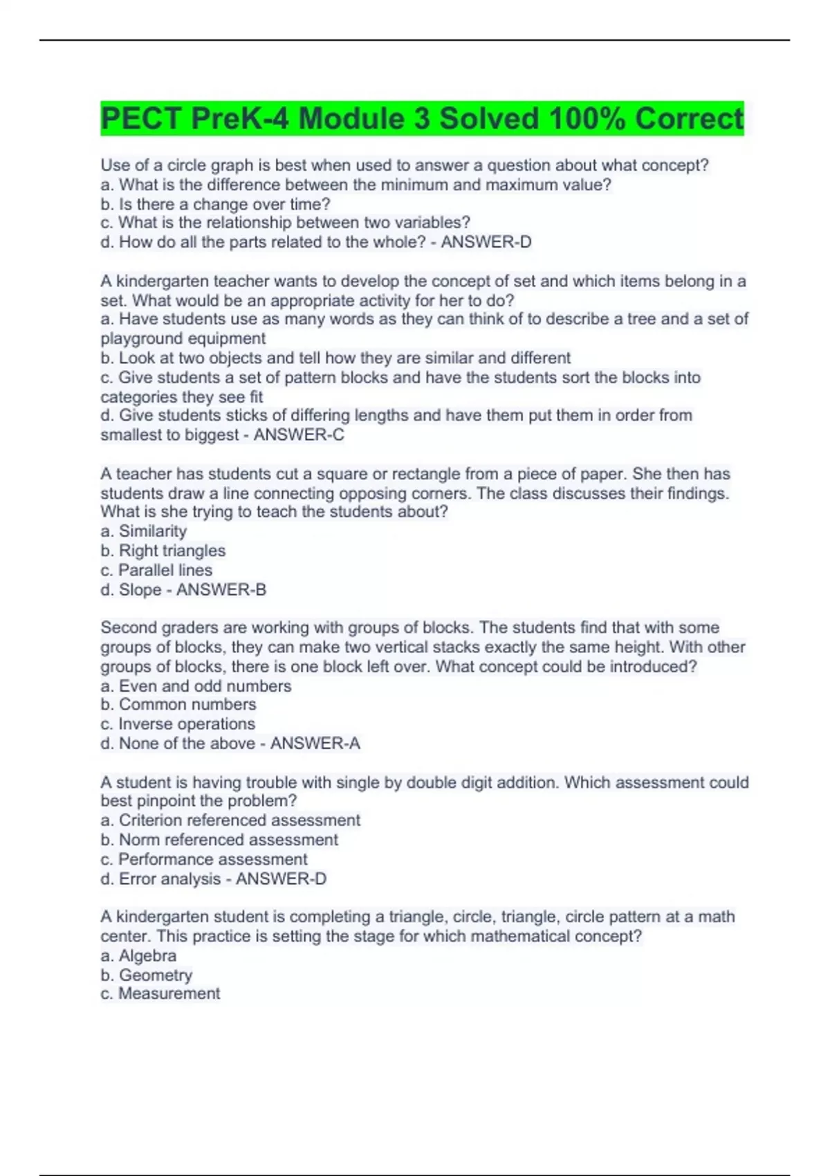 Use of a circle graph is best when used to answer a question about what concept? a. What is the difference between the minimum and maximum value? b. Is there a change over time? c. What is the relationship between two variables? d. How do all the parts related to the whole? - ANSWER-D A kindergarten teacher wants to develop the concept of set and which items belong in a set. What would be an appropriate activity for her to do? a. Have students use as many words as they can think of to describe a tree and a set of playground equipment b. Look at two objects and tell how they are similar and different c. Give students a set of pattern blocks and have the students sort the blocks into categories they see fit d. Give students sticks of differing lengths and have them put them in order from smallest to biggest - ANSWER-C A teacher has students cut a square or rectangle from a piece of paper. She then has students draw a line connecting opposing corners. The class discusses their findings. What is she trying to teach the students about? a. Similarity b. Right triangles c. Parallel lines d. Slope - ANSWER-B Second graders are working with groups of blocks. The students find that with some groups of blocks, they can make two vertical stacks exactly the same height. With other groups of blocks, there is one block left over. What concept could be introduced? a. Even and odd numbers b. Common numbers c. Inverse operations d. None of the above - ANSWER-A A student is having trouble with single by double digit addition. Which assessment could best pinpoint the problem? a. Criterion referenced assessment b. Norm referenced assessment c. Performance assessment d. Error analysis - ANSWER-D A kindergarten student is completing a triangle, circle, triangle, circle pattern at a math center. This practice is setting the stage for which mathematical concept? a. Algebra b. Geometry c. Measurement