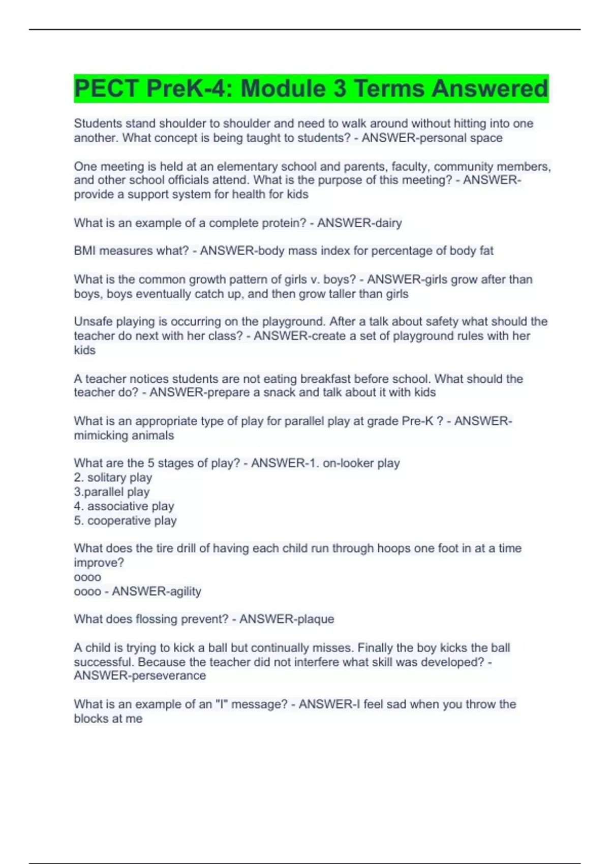 Students stand shoulder to shoulder and need to walk around without hitting into one another. What concept is being taught to students? - ANSWER-personal space One meeting is held at an elementary school and parents, faculty, community members, and other school officials attend. What is the purpose of this meeting? - ANSWER-provide a support system for health for kids What is an example of a complete protein? - ANSWER-dairy BMI measures what? - ANSWER-body mass index for percentage of body fat What is the common growth pattern of girls v. boys? - ANSWER-girls grow after than boys, boys eventually catch up, and then grow taller than girls Unsafe playing is occurring on the playground. After a talk about safety what should the teacher do next with her class? - ANSWER-create a set of playground rules with her kids A teacher notices students are not eating breakfast before school. What should the teacher do? - ANSWER-prepare a snack and talk about it with kids What is an appropriate type of play for parallel play at grade Pre-K ? - ANSWER-mimicking animals What are the 5 stages of play? - ANSWER-1. on-looker play 2. solitary play lel play 4. associative play 5. cooperative play What does the tire drill of having each child run through hoops one foot in at a time improve? oooo oooo - ANSWER-agility What does flossing prevent? - ANSWER-plaque A child is trying to kick a ball but continually misses. Finally the boy kicks the ball successful. Because the teacher did not interfere what skill was developed? - ANSWER-perseverance What is an example of an "I" message? - ANSWER-I feel sad when you throw the blocks at me