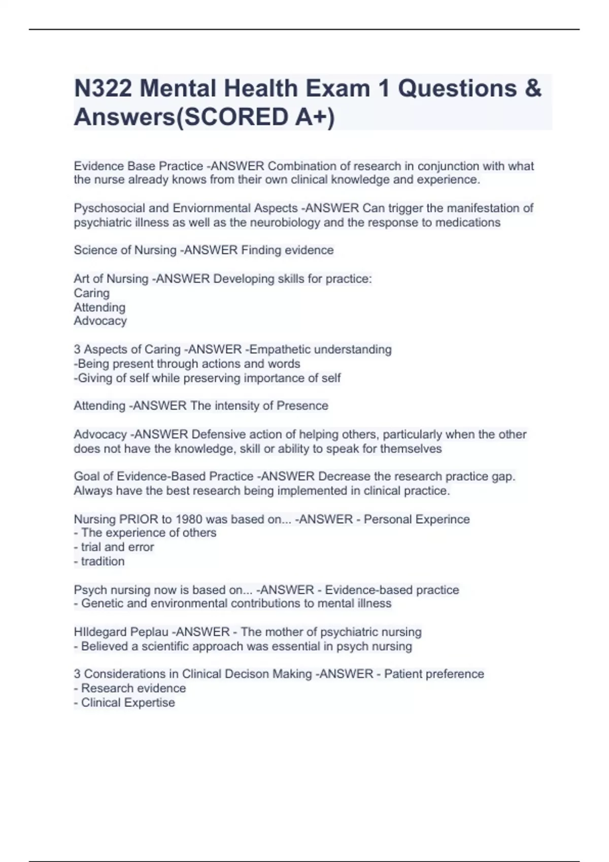 Evidence Base Practice -ANSWER Combination of research in conjunction with what the nurse already knows from their own clinical knowledge and experience. Pyschosocial and Enviornmental Aspects -ANSWER Can trigger the manifestation of psychiatric illness as well as the neurobiology and the response to medications Science of Nursing -ANSWER Finding evidence Art of Nursing -ANSWER Developing skills for practice: Caring Attending Advocacy 3 Aspects of Caring -ANSWER -Empathetic understanding -Being present through actions and words -Giving of self while preserving importance of self Attending -ANSWER The intensity of Presence Advocacy -ANSWER Defensive action of helping others, particularly when the other does not have the knowledge, skill or ability to speak for themselves Goal of Evidence-Based Practice -ANSWER Decrease the research practice gap. Always have the best research being implemented in clinical