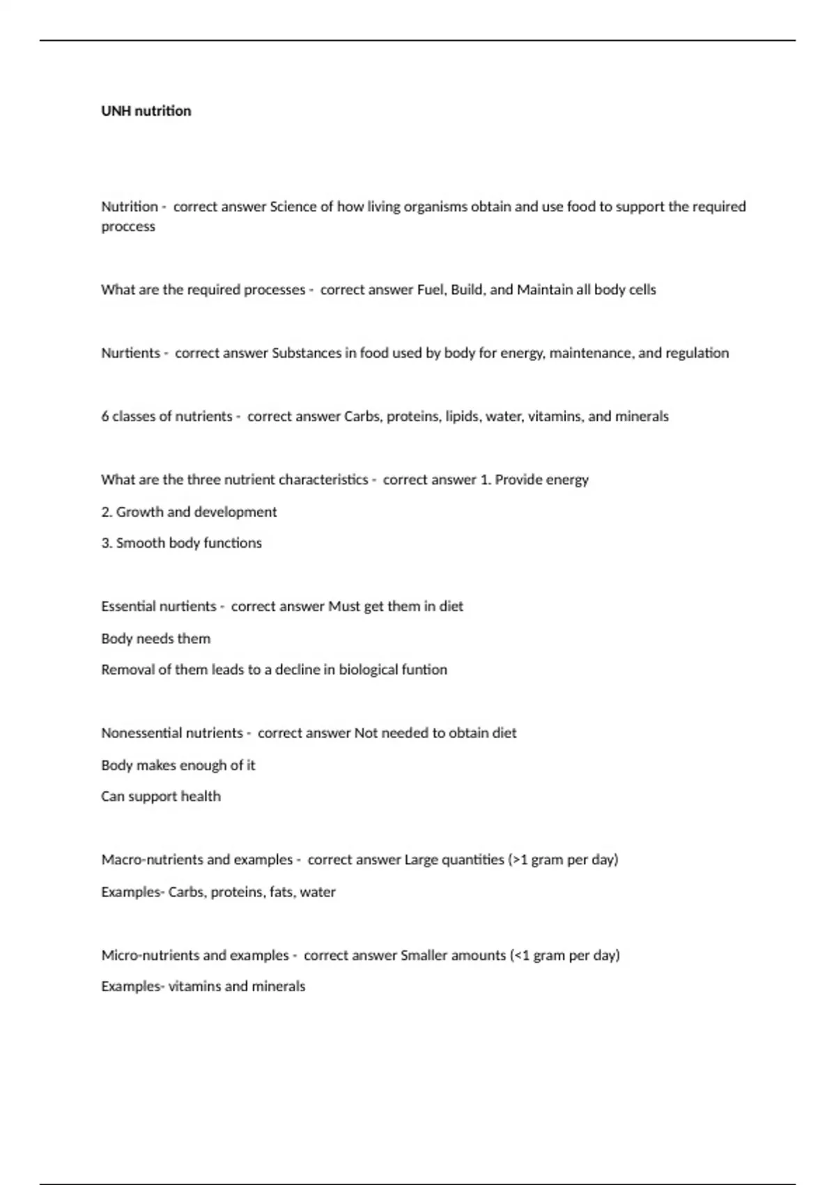 Nutrition - correct answer Science of how living organisms obtain and use food to support the required proccess What are the required processes - correct answer Fuel, Build, and Maintain all body cells Nurtients - correct answer Substances in food used by body for energy, maintenance, and regulation 6 classes of nutrients - correct answer Carbs, proteins, lipids, water, vitamins, and minerals What are the three nutrient characteristics - correct answer 1. Provide energy 2. Growth and development 3. Smooth body functions Essential nurtients - correct answer Must get them in diet Body needs them Removal of them leads to a decline in biological funtion Nonessential nutrients - correct answer Not needed to obtain diet Body makes enough of it Can support health Macro-nutrients and examples - correct answer Large quantities (>1 gram per day) Examples- Carbs, proteins, fats, water Micro-nutrients and examples - correct answer Smaller amounts (<1 gram per day) Examples- vitamins and minerals