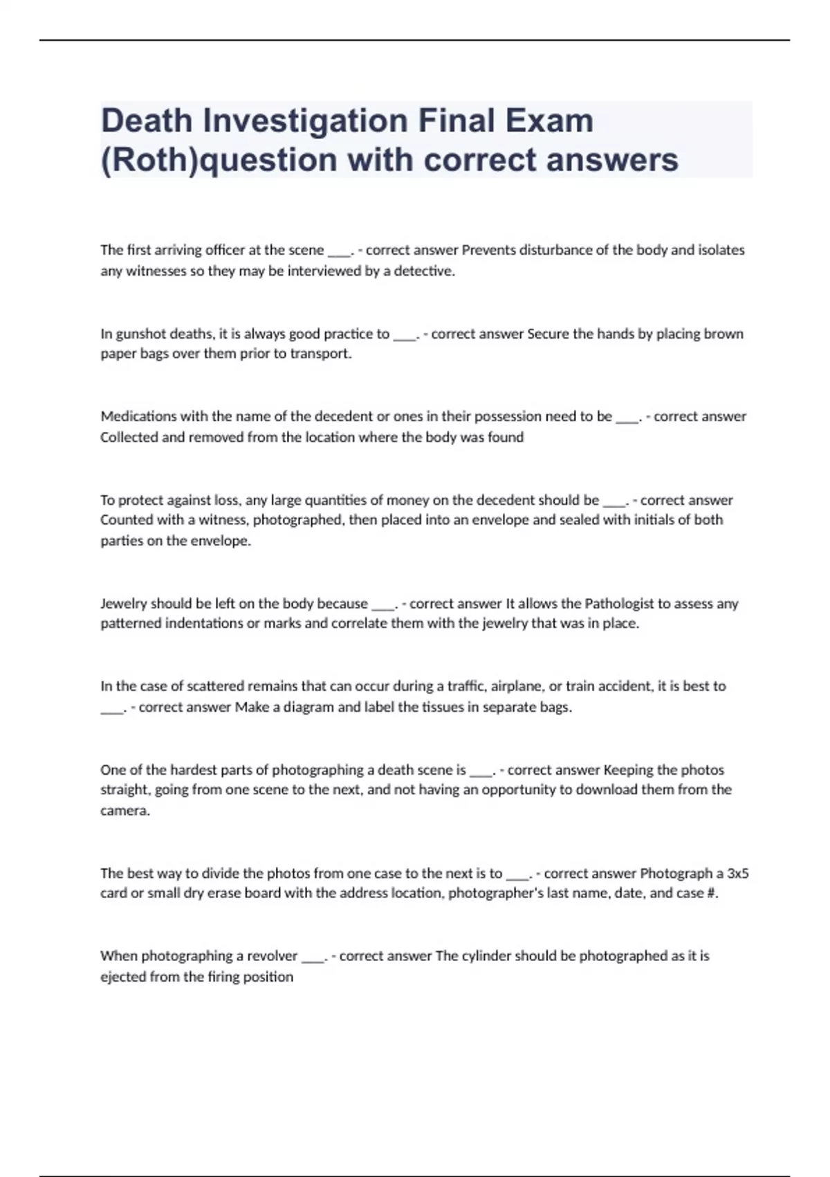 Death Investigation Final Exam (Roth)question with correct answersThe first arriving officer at the scene ___. - correct answer Prevents disturbance of the body and isolates any witnesses so they may be interviewed by a detective. In gunshot deaths, it is always good practice to ___. - correct answer Secure the hands by placing brown paper bags over them prior to transport. Medications with the name of the decedent or ones in their possession need to be ___. - correct answer Collected and removed from the location where the body was found To protect against loss, any large quantities of money on the decedent should be ___. - correct answer Counted with a witness, photographed, then placed into an envelope and sealed with initials of both parties on the envelope. Jewelry should be left on the body because ___. - correct answer It allows the Pathologist to assess any patterned indentations or marks and correlate them with the jewelry that was in place. In the case of scattered remains that can occur during a traffic, airplane, or train accident, it is best to ___. - correct answer Make a diagram and label the tissues in separate bags. One of the hardest parts of photographing a death scene is ___. - correct answer Keeping the photos straight, going from one scene to the next, and not having an opportunity to download them from the camera. The best way to divide the photos from one case to the next is to ___. - correct answer Photograph a 3x5 card or small dry erase board with the address location, photographer's last name, date, and case #. When photographing a revolver ___. - correct answer The cylinder should be photographed as it is ejected from the firing position