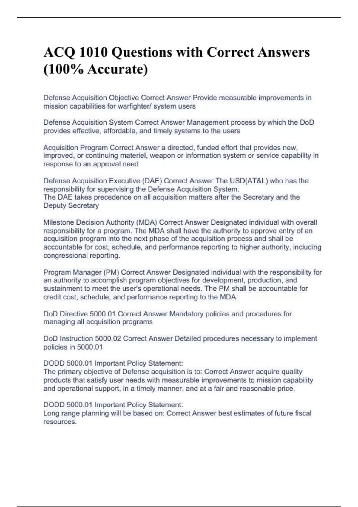 Defense Acquisition Objective Correct Answer Provide measurable improvements in mission capabilities for warfighter/ system users Defense Acquisition System Correct Answer Management process by which the DoD provides effective, affordable, and timely systems to the users Acquisition Program Correct Answer a directed, funded effort that provides new, improved, or continuing materiel, weapon or information system or service capability in response to an approval need Defense Acquisition Executive (DAE) Correct Answer The USD(AT&L) who has the responsibility for supervising the Defense Acquisition System. The DAE takes precedence on all acquisition matters after the Secretary and the Deputy Secretary Milestone Decision Authority (MDA) Correct Answer Designated individual with overall responsibility for a program. The MDA shall have the authority to approve entry of an acquisition program into the next phase of the acquisition process and shall be accountable for cost, schedule, and performance reporting to higher authority, including congressional reporting. Program Manager (PM) Correct Answer Designated individual with the responsibility for an authority to accomplish program objectives for development, production, and sustainment to meet the user's operational needs. The PM shall be accountable for credit cost, schedule, and performance reporting to the MDA. DoD Directive 5000.01 Correct Answer Mandatory policies and procedures for managing all acquisition programs DoD Instruction 5000.02 Correct Answer Detailed procedures necessary to implement policies in 5000.01 DODD 5000.01 Important Policy Statement: The primary objective of Defense acquisition is to: Correct Answer acquire quality products that satisfy user needs with measurable improvements to mission capability and operational support, in a timely manner, and at a fair and reasonable price. DODD 5000.01 Important Policy Statement: Long range planning will be based on: Correct Answer best estimates of future fiscal resources.