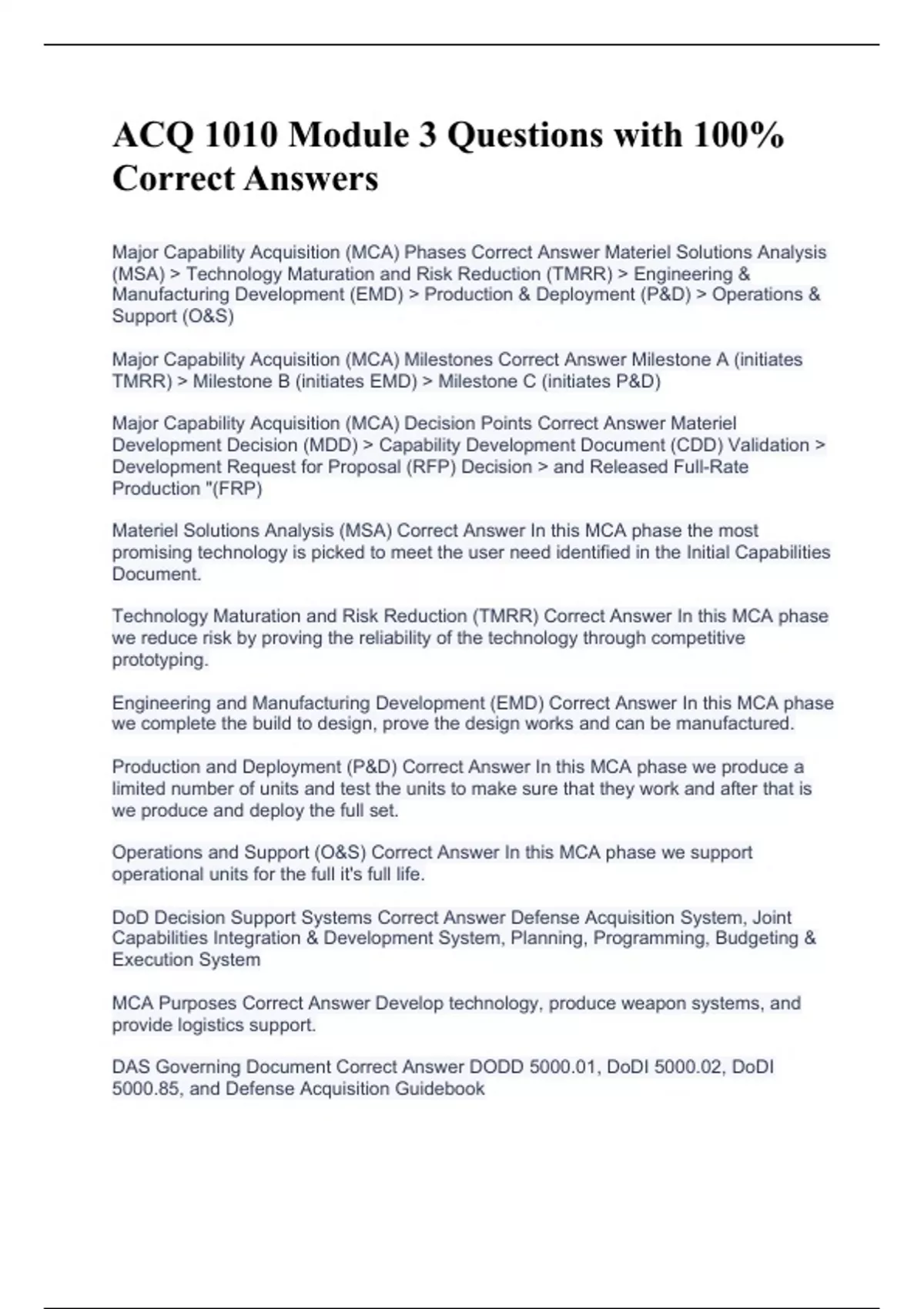 Major Capability Acquisition (MCA) Phases Correct Answer Materiel Solutions Analysis (MSA) > Technology Maturation and Risk Reduction (TMRR) > Engineering & Manufacturing Development (EMD) > Production & Deployment (P&D) > Operations & Support (O&S) Major Capability Acquisition (MCA) Milestones Correct Answer Milestone A (initiates TMRR) > Milestone B (initiates EMD) > Milestone C (initiates P&D) Major Capability Acquisition (MCA) Decision Points Correct Answer Materiel Development Decision (MDD) > Capability Development Document (CDD) Validation > Development Request for Proposal (RFP) Decision > and Released Full-Rate Production "(FRP) Materiel Solutions Analysis (MSA) Correct Answer In this MCA phase the most promising technology is picked to meet the user need identified in the Initial Capabilities Document. Technology Maturation and Risk Reduction (TMRR) Correct Answer In this MCA phase we reduce risk by proving the reliability of the technology through competitive prototyping. Engineering and Manufacturing Development (EMD) Correct Answer In this MCA phase we complete the build to design, prove the design works and can be manufactured. Production and Deployment (P&D) Correct Answer In this MCA phase we produce a limited number of units and test the units to make sure that they work and after that is we produce and deploy the full set. Operations and Support (O&S) Correct Answer In this MCA phase we support operational units for the full it's full life. DoD Decision Support Systems Correct Answer Defense Acquisition System, Joint Capabilities Integration & Development System, Planning, Programming, Budgeting & Execution System MCA Purposes Correct Answer Develop technology, produce weapon systems, and provide logistics support. DAS Governing Document Correct Answer DODD 5000.01, DoDI 5000.02, DoDI 5000.85, and Defense Acquisition Guidebook