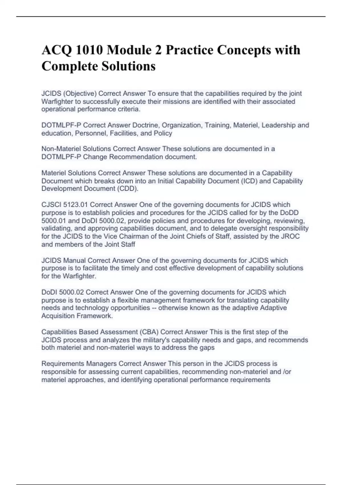 JCIDS (Objective) Correct Answer To ensure that the capabilities required by the joint Warfighter to successfully execute their missions are identified with their associated operational performance criteria. DOTMLPF-P Correct Answer Doctrine, Organization, Training, Materiel, Leadership and education, Personnel, Facilities, and Policy Non-Materiel Solutions Correct Answer These solutions are documented in a DOTMLPF-P Change Recommendation document. Materiel Solutions Correct Answer These solutions are documented in a Capability Document which breaks down into an Initial Capability Document (ICD) and Capability Development Document (CDD). CJSCI 5123.01 Correct Answer One of the governing documents for JCIDS which purpose is to establish policies and procedures for the JCIDS called for by the DoDD 5000.01 and DoDI 5000.02, provide policies and procedures for developing, reviewing, validating, and approving capabilities document, and to delegate oversight responsibility for the JCIDS to the Vice Chairman of the Joint Chiefs of Staff, assisted by the JROC and members of the Joint Staff JCIDS Manual Correct Answer One of the governing documents for JCIDS which purpose is to facilitate the timely and cost effective development of capability solutions for the Warfighter. DoDI 5000.02 Correct Answer One of the governing documents for JCIDS which purpose is to establish a flexible management framework for translating capability needs and technology opportunities -- otherwise known as the adaptive Adaptive Acquisition Framework.