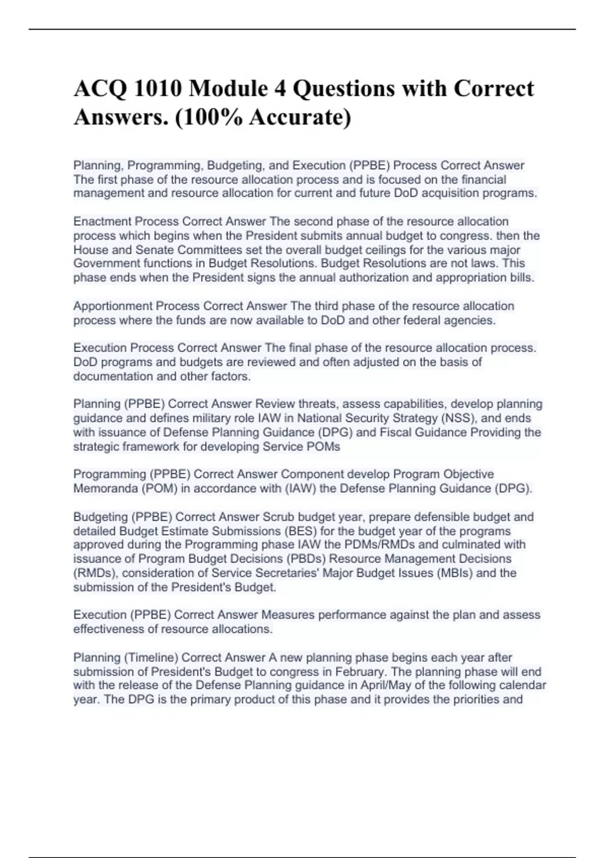 Planning, Programming, Budgeting, and Execution (PPBE) Process Correct Answer The first phase of the resource allocation process and is focused on the financial management and resource allocation for current and future DoD acquisition programs. Enactment Process Correct Answer The second phase of the resource allocation process which begins when the President submits annual budget to congress. then the House and Senate Committees set the overall budget ceilings for the various major Government functions in Budget Resolutions. Budget Resolutions are not laws. This phase ends when the President signs the annual authorization and appropriation bills. Apportionment Process Correct Answer The third phase of the resource allocation process where the funds are now available to DoD and other federal agencies. Execution Process Correct Answer The final phase of the resource allocation process. DoD programs and budgets are reviewed and often adjusted on the basis of documentation and other factors. Planning (PPBE) Correct Answer Review threats, assess capabilities, develop planning guidance and defines military role IAW in National Security Strategy (NSS), and ends with issuance of Defense Planning Guidance (DPG) and Fiscal Guidance Providing the strategic framework for developing Service POMs Programming (PPBE) Correct Answer Component develop Program Objective Memoranda (POM) in accordance with (IAW) the Defense Planning Guidance (DPG). Budgeting (PPBE) Correct Answer Scrub budget year, prepare defensible budget and detailed Budget Estimate Submissions (BES) for the budget year of the programs approved during the Programming phase IAW the PDMs/RMDs and culminated with issuance of Program Budget Decisions (PBDs) Resource Management Decisions (RMDs), consideration of Service Secretaries' Major Budget Issues (MBIs) and the submission of the President's Budget. Execution (PPBE) Correct Answer Measures performance against the plan and assess effectiveness of resource allocations. Planning (Timeline) Correct Answer A new planning phase begins each year after submission of President's Budget to congress in February. The planning phase will end with the release of the Defense Planning guidance in April/May of the following calendar year. The DPG is the primary product of this phase and it provides the priorities and