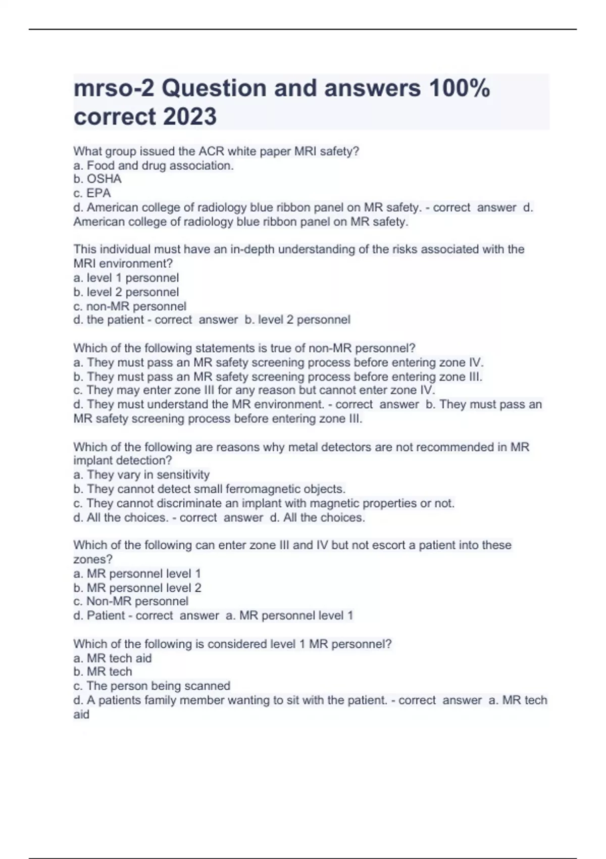 mrso-2 Question and answers 100% correct 2023 What group issued the ACR white paper MRI safety? a. Food and drug association. b. OSHA c. EPA d. American college of radiology blue ribbon panel on MR safety. - correct answer d. American college of radiology blue ribbon panel on MR safety. This individual must have an in-depth understanding of the risks associated with the MRI environment? a. level 1 personnel