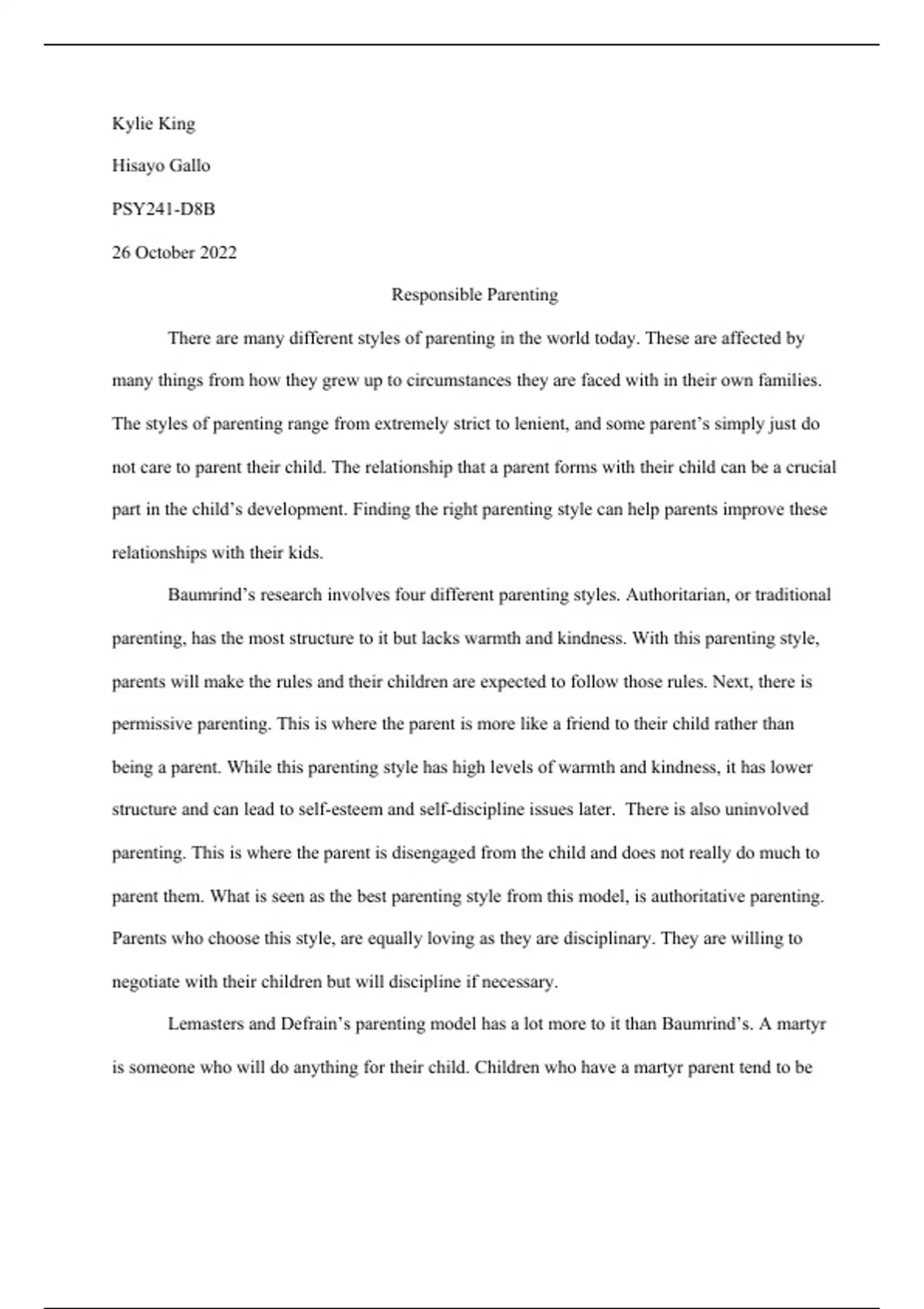 This essay/reflection talks about different parenting styles and how each one affects those who experience it. It then goes on to explain what the best parenting style is from a psychological stand point.