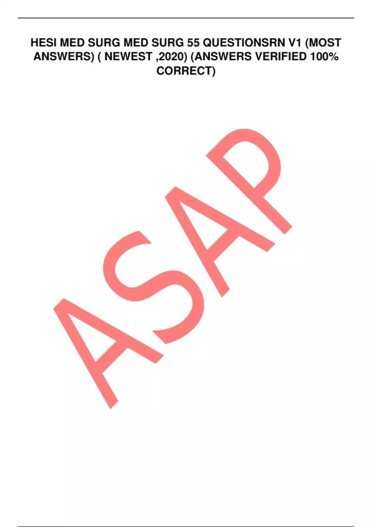 HESI MED SURG MED SURG 55 QUESTIONS RN V1 (MOST ANSWERS) ( NEWEST ,2020) (ANSWERS VERIFIED 100% CORRECT) HESI MED SURG / MED SURG 55 QUESTIONS RN V1 (MOST ANSWER(S)) A patient had abdominal surgery and states that after coughing it feels like his guts has spilled out. What should the nurse do first? Visualize the abdominal area A patient has been taking Kenalog (corticosteroid) with increase redness... Schedule an appointment A patient hd a BDP. What warrants further intervention? Positive gastro occult emesis A patient who has been taking B12 says he's fatigue. What lab to monitor? CBC A patient with Parkinson is walking. ? Confirm that its effective Whats priority for a patient who is allergic to bananas? ReplaceA latex How to prevent a renal calculi? limit tea and chocolate If a patient is in F-vib what medication to give? Adenosine A nurse is caring for a patient and is unable to palpate a pedal pulse. What should the nurse do next? Obtain a doppler A client with a history of COPD has established a walking program. How do we know that walking is effective? Cardiovascular improvement Post -op A client informs the nurse that he know all about how to breath. How should the nurse respond? .... Order 100 units in 250ml to infuse at 12units/hr 12/100 *250= 30 A client complains of pain in the right calf. What is the nurse's priority? Remain in bed A client just returned after having a TURP and has clot. What should the nurse do? slowly irrigate What's Priority for a client with Multiple Scerolosis and has urinary rention? Self cathetherization