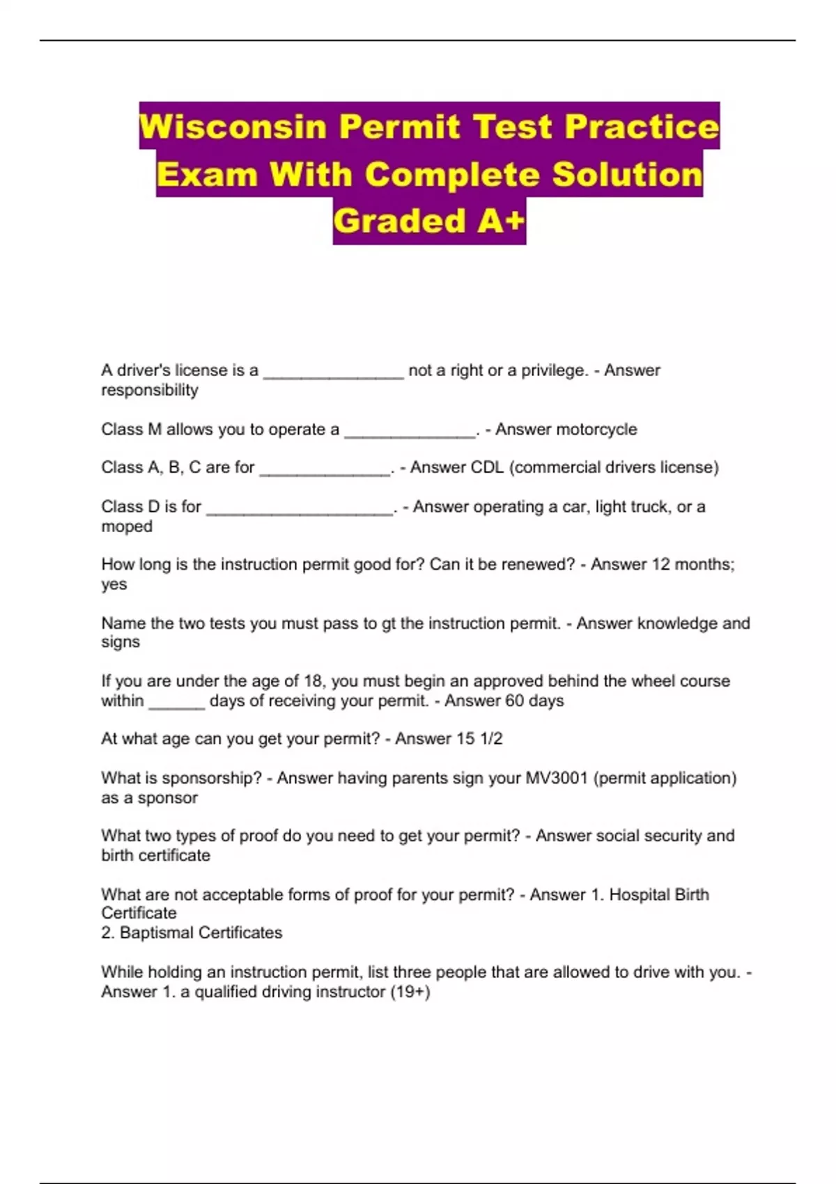 Wisconsin Permit Test Practice Exam With Complete Solution Graded A+...