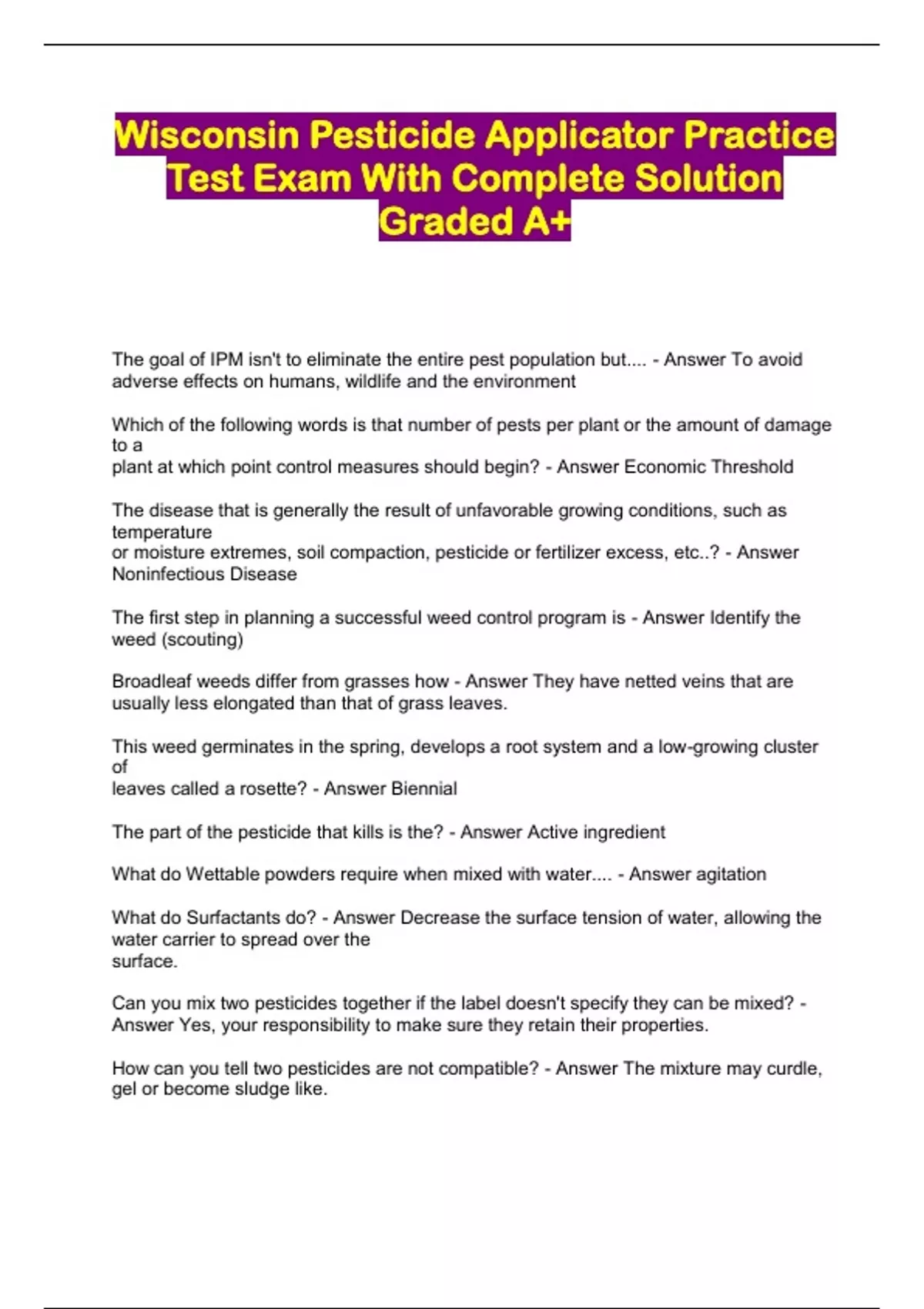 Wisconsin Pesticide Applicator Practice Test Exam With Complete Solution Graded A+