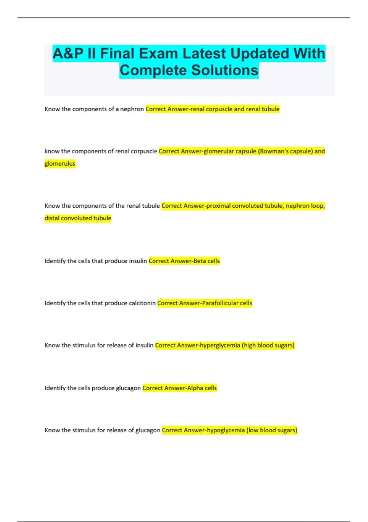 Know the components of a nephron Correct Answer-renal corpuscle and renal tubule know the components of renal corpuscle Correct Answer-glomerular capsule (Bowman's capsule) and glomerulus Know the components of the renal tubule Correct Answer-proximal convoluted tubule, nephron loop, distal convoluted tubule Identify the cells that produce insulin Correct Answer-Beta cells Identify the cells that produce calcitonin Correct Answer-Parafollicular cells Know the stimulus for release of insulin Correct Answer-hyperglycemia (high blood sugars) Identify the cells produce glucagon Correct Answer-Alpha cells Know the stimulus for release of glucagon Correct Answer-hypoglycemia (low blood sugars)Identify the enzyme that is involved in the pathways of external and internal respiration Correct Answercarbonic anhydrase Identify the methods of carbon dioxide transport within blood. Correct Answer-dissolved carbon dioxide, carboxyhemoglobin, bicarbonate ions. Identify the methods of oxygen transport within blood Correct Answer-dissolved oxygen, oxyhemoglobin define hypoxia Correct Answer-low oxygen levels Identify a potential cause of an elevated basophil count Correct Answer-start of allergic reaction Identify the structure that fails to function properly when a person chokes Correct Answer-epiglottis Identify the structure that fails to function properly during the clinical condition of gastroesophageal reflux disease (GERD) Correct Answer-lower espohageal sphincter Identify the correct order of the components of the digestive/GI tract from the beginning to the end Correct Answer-mouth -> pharynx -> esophagus -> stomach -> small intestine -> large intestine (colon) -> colonIdentify the components of the small intestine Correct Answer-duodenum, jejunum, ileum Identify the sections of the stomach Correct Answer-cardia, fundus, body, pylorus Identify the normal pH range of blood Correct Answer-7.35-7.45 Identify the element that allows hemoglobin to bind oxygen Correct Answer-iron Identify factors that can change or alter stroke volume Correct Answer-preload, contractility, afterload Identify the formed elements found in blood Correct Answer-RBC, WBC, platelets Be able to determine a person's ABO blood type based on the presence of the ABO antibodies in that person's blood Correct Answer-Type A blood- B antibodies Type B blood- A antibodies Type AB blood- NO antibodies Type O- A and B antibodies