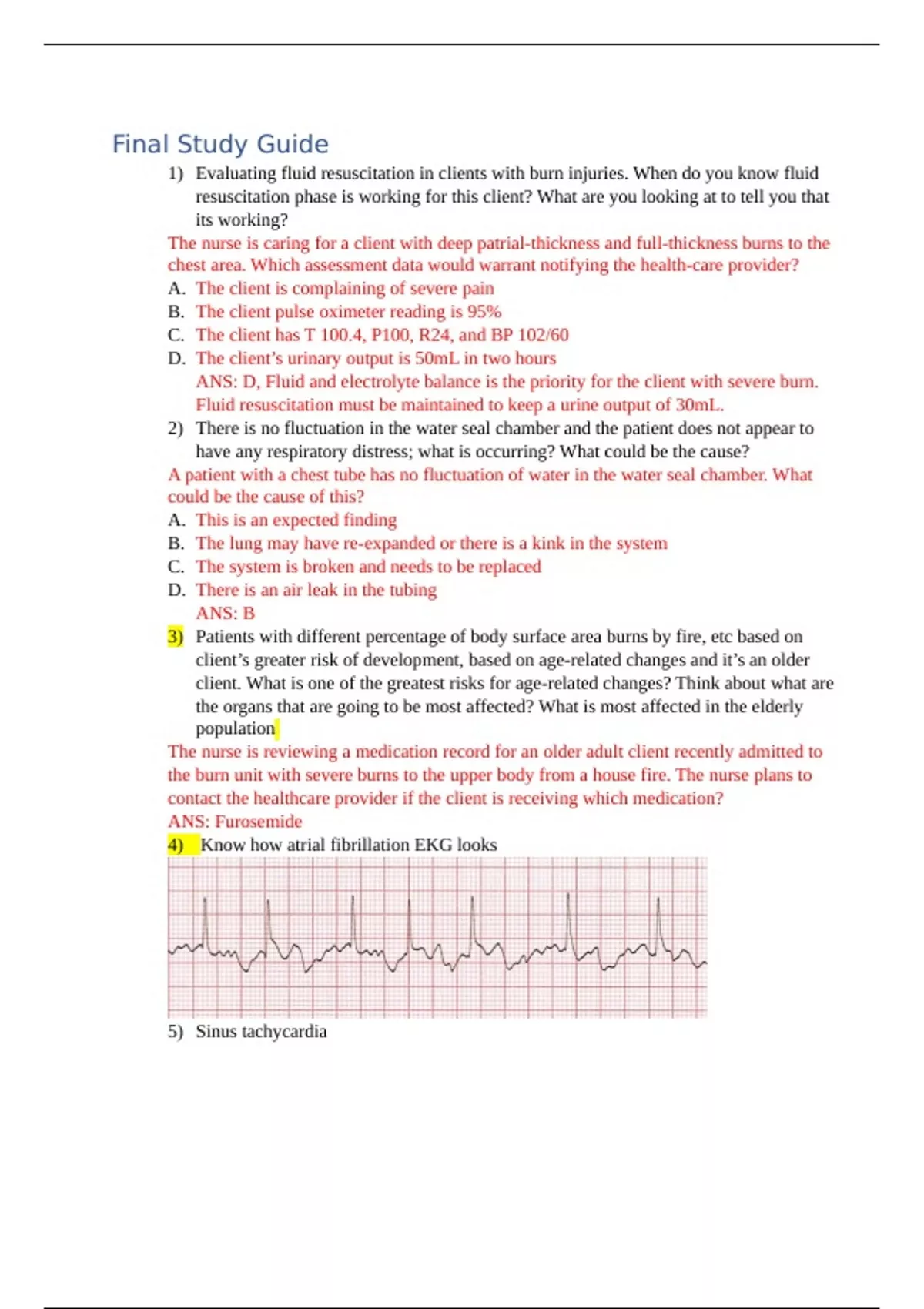 Final Study Guide 1) Evaluating fluid resuscitation in clients with burn injuries. When do you know fluid resuscitation phase is working for this client? What are you looking at to tell you that its working? The nurse is caring for a client with deep patrial-thickness and full-thickness burns to the chest area. Which assessment data would warrant notifying the health-care provider? A. The client is complaining of severe pain B. The client pulse oximeter reading is 95% C. The client has T 100.4, P100, R24, and BP 102/60 D. The client’s urinary output is 50mL in two hours ANS: D, Fluid and electrolyte balance is the priority for the client with severe burn. Fluid resuscitation must be maintained to keep a urine output of 30mL. 2) There is no fluctuation in the water seal chamber and the patient does not appear to have any respiratory distress; what is occurring? What could be the cause? A patient with a chest tube has no fluctuation of water in the water seal chamber. What could be the cause of this? A. This is an expected finding B. The lung may have re-expanded or there is a kink in the system C. The system is broken and needs to be replaced D. There is an air leak in the tubing ANS: B 3) Patients with different percentage of body surface area burns by fire, etc based on client’s greater risk of development, based on age-related changes and it’s an older client. What is one of the greatest risks for age-related changes? Think about what are the organs that are going to be most affected? What is most affected in the elderly population The nurse is reviewing a medication record for an older adult client recently admitted to the burn unit with severe burns to the upper body from a house fire. The nurse plans to contact the healthcare provider if the client is receiving which medication? ANS: Furosemide 4) Know how atrial fibrillation EKG looks 5) Sinus tachycardia