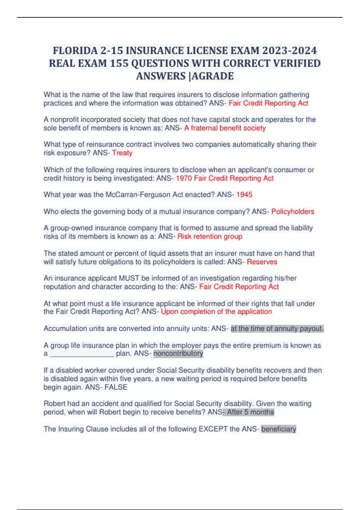 FLORIDA 2-15 INSURANCE LICENSE EXAM REAL EXAM 155 QUESTIONS WITH CORRECT VERIFIED ANSWERS |AGRADE What is the name of the law that requires insurers to disclose information gathering practices and where the information was obtained? ANS- Fair Credit Reporting Act A nonprofit incorporated society that does not have capital stock and operates for the sole benefit of members is known as: ANS- A fraternal benefit society What type of reinsurance contract involves two companies automatically sharing their risk exposure? ANS- Treaty Which of the following requires insurers to disclose when an applicant's consumer or credit history is being investigated: ANS- 1970 Fair Credit Reporting Act What year was the McCarran-Ferguson Act enacted? ANS- 1945