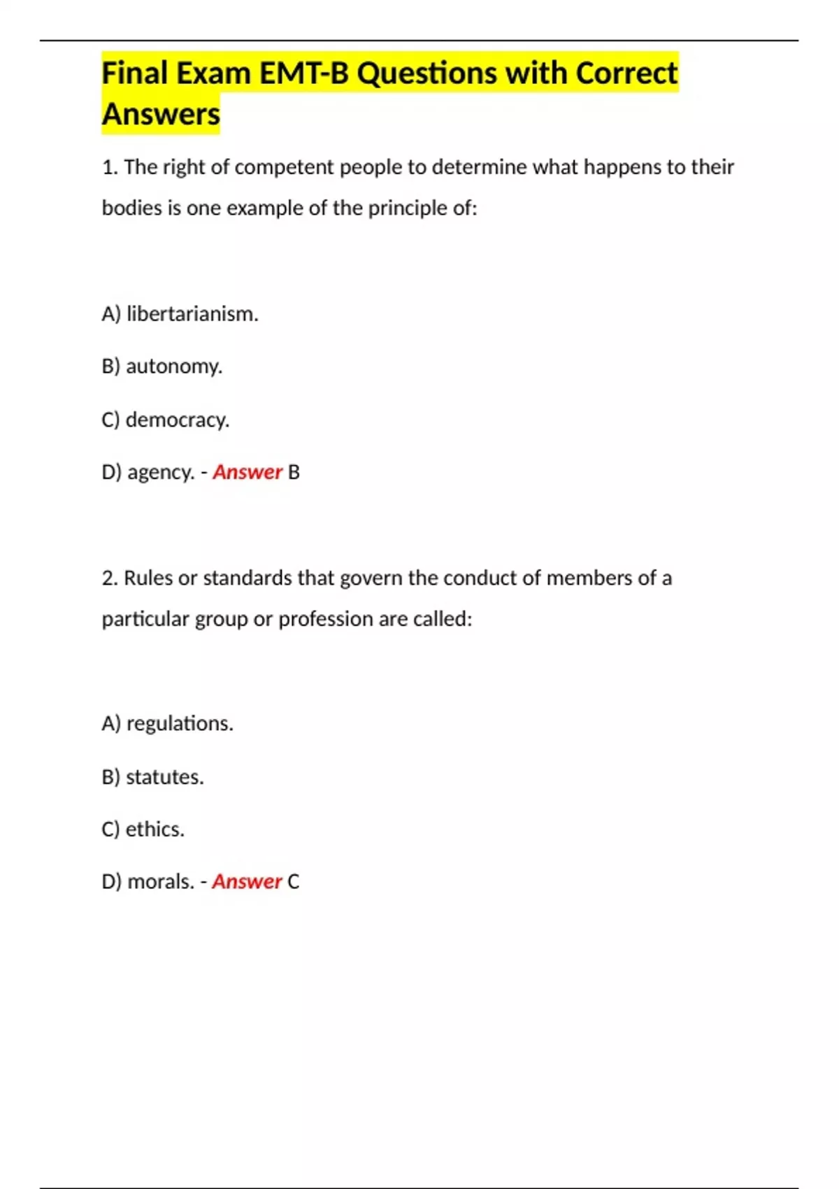 final exam emt b questions with correct answers