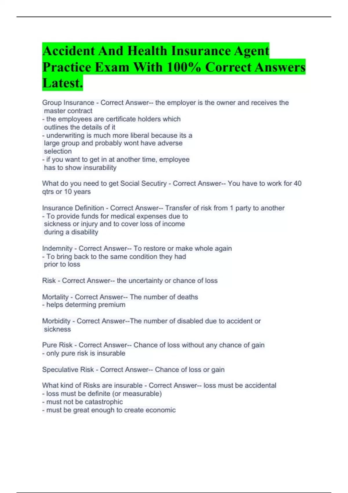 Accident And Health Insurance Agent Practice Exam With 100% Correct Answers Latest.