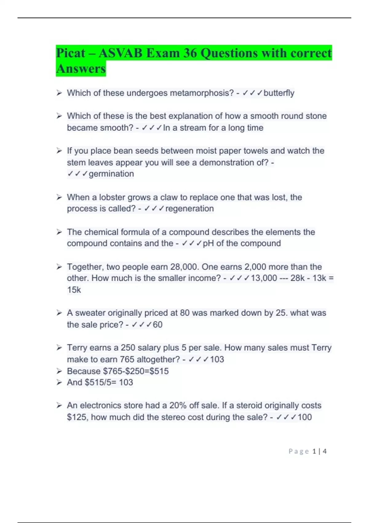 Picat – ASVAB Exam 36 Questions with correct AnswersPicat – ASVAB Exam 36 Questions with correct Answers