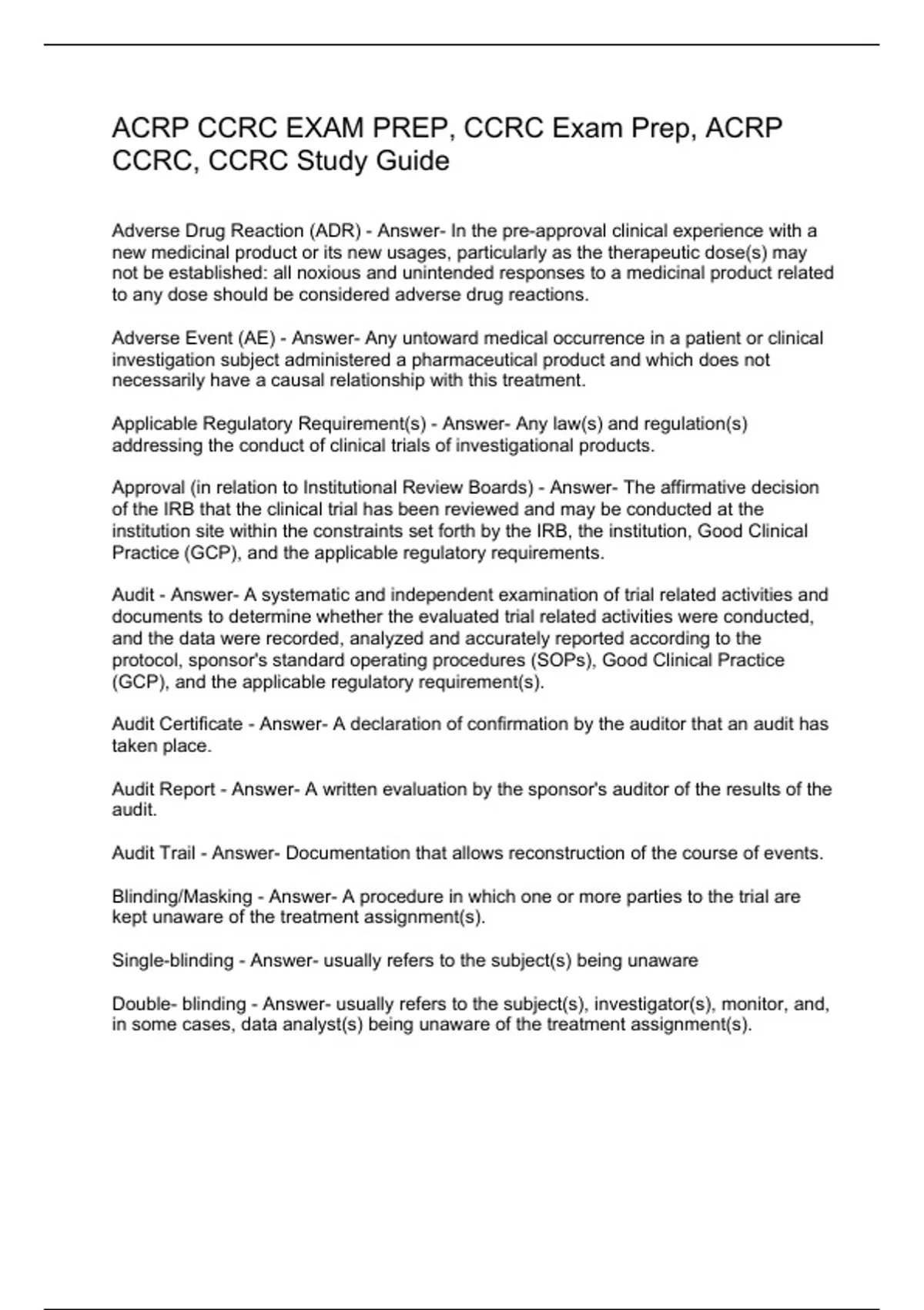 Adverse Drug Reaction (ADR) - Answer- In the pre-approval clinical experience with a new medicinal product or its new usages, particularly as the therapeutic dose(s) may not be established: all noxious and unintended responses to a medicinal product related to any dose should be considered adverse drug reactions. Adverse Event (AE) - Answer- Any untoward medical occurrence in a patient or clinical investigation subject administered a pharmaceutical product and which does not necessarily have a causal relationship with this treatment. Applicable Regulatory Requirement(s) - Answer- Any law(s) and regulation(s) addressing the conduct of clinical trials of investigational products. Approval (in relation to Institutional Review Boards) - Answer- The affirmative decision of the IRB that the clinical trial has been reviewed and may be conducted at the institution site within the constraints set forth by the IRB, the institution, Good Clinical Practice (GCP), and the applicable regulatory requirements. Audit - Answer- A systematic and independent examination of trial related activities and documents to determine whether the evaluated trial related activities were conducted, and the data were recorded, analyzed and accurately reported according to the protocol, sponsor's standard operating procedures (SOPs), Good Clinical Practice (GCP), and the applicable regulatory requirement(s). Audit Certificate - Answer- A declaration of confirmation by the auditor that an audit has taken place. Audit Report - Answer- A written evaluation by the sponsor's auditor of the results of the audit. Audit Trail - Answer- Documentation that allows reconstruction of the course of events. Blinding/Masking - Answer- A procedure in which one or more parties to the trial are kept unaware of the treatment assignment(s). Single-blinding - Answer- usually refers to the subject(s) being unaware Double- blinding - Answer- usually refers to the subject(s), investigator(s), monitor, and, in some cases, data analyst(s) being unaware of the treatment assignment(s).