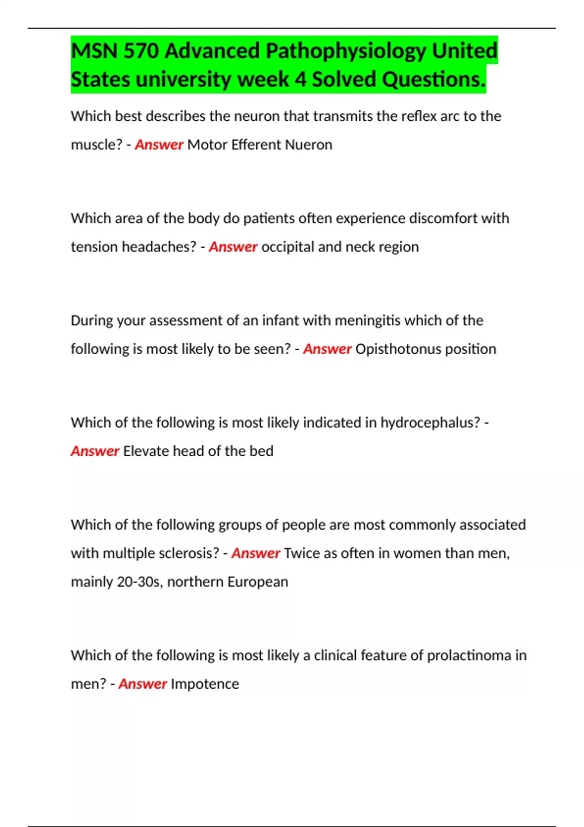 MSN 570 Advanced Pathophysiology United States university week 4 Solved Questions.