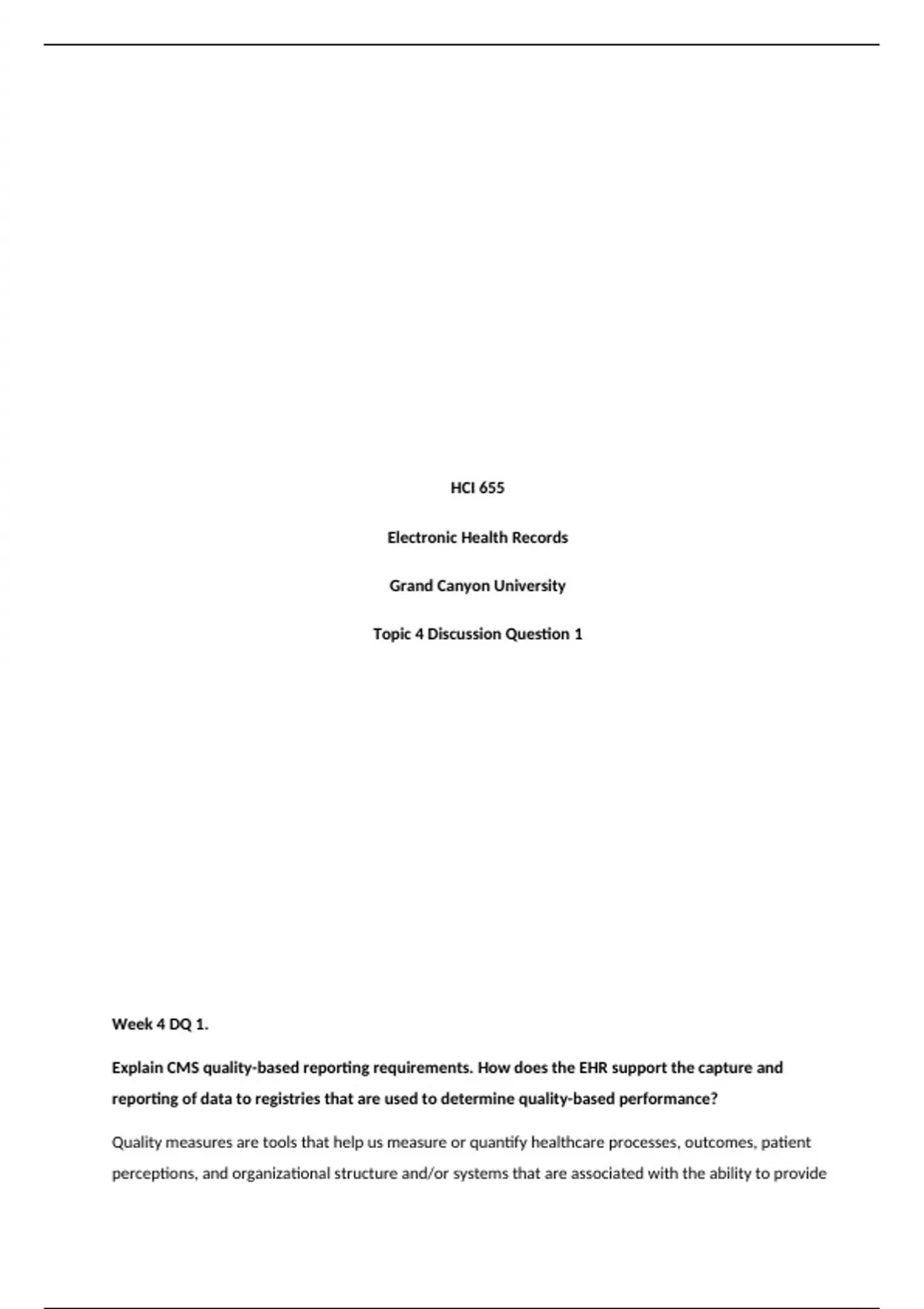 HCI 655 (Electronic Health Records) Topic 4 Discussion Question 1 Description: Explain CMS quality-based reporting requirements. How does the EHR support the capture and reporting of data to registries that are used to determine quality-based performance?